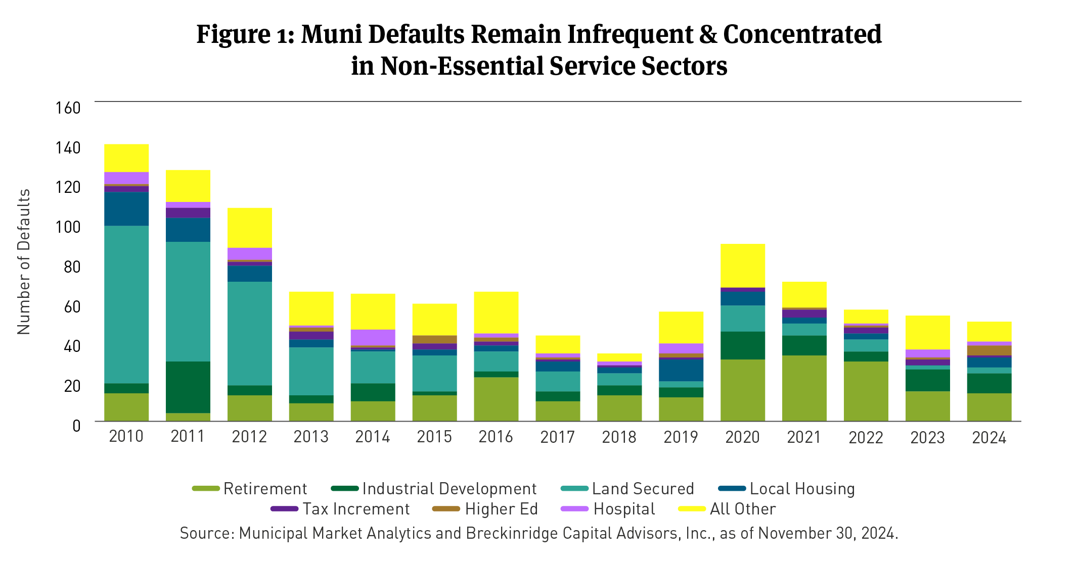 Through early December, issuers had reported 59 monetary defaults in a market of over 37,000 issuers.1 Impaired bonds represented 1.2 percent of the market, and only two governments had filed for Chapter 9 bankruptcy, the lowest figure since 2008.2,3 Defaults remain concentrated in less essential sectors, with the most frequent delinquencies arising in the nursing home, industrial development bond, charter school, and single site housing bond sectors. The increasingly stressed higher education sector reported five defaults in 2024 (See Figure 1).