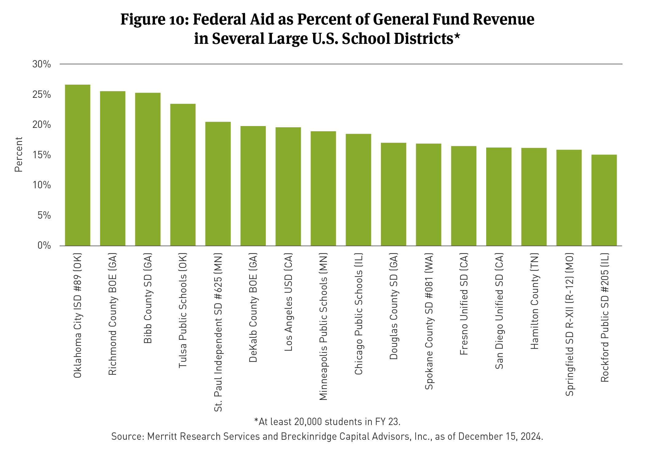 Breckinridge highlighted these risks as early as 2022 in “Is it time to go back to school on school credit?.” We anticipate more public school district downgrades in 2025. Risks seem highest for districts with many high-needs students and exposure to competition via school choice programs. Districts that cannot adjust their spending once federal pandemic aid is depleted are also more vulnerable. Some large-county and urban districts that come to market regularly exhibit meaningful reliance on federal support (See Figure 10).21
