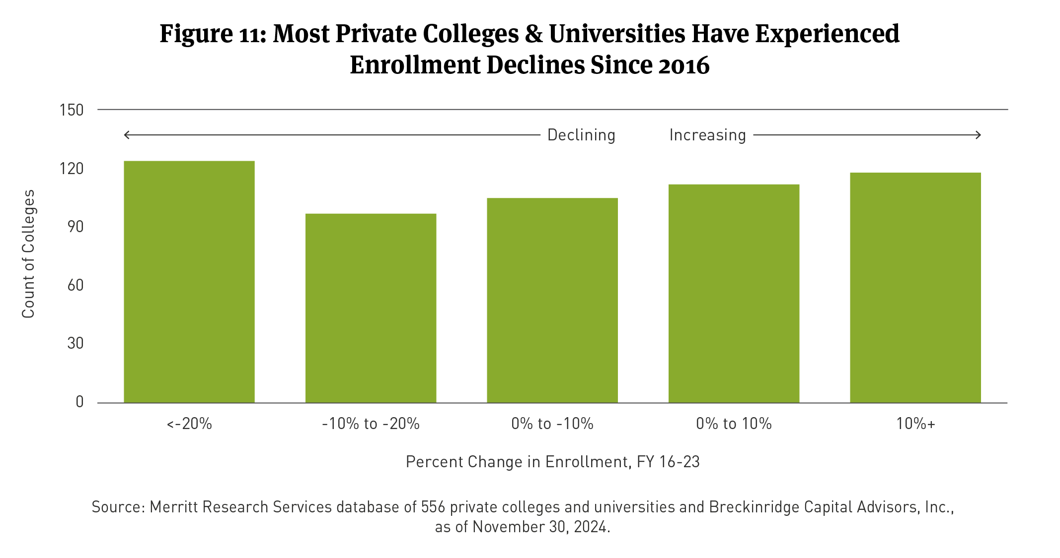 Higher education bond issuers are also under pressure. Private universities and colleges continue to face increased competition from lower-cost providers, growing deferred maintenance, and declining enrollment. Public confidence in higher education has declined consistently over the past decade, and universities are now vulnerable to federal budget cuts or endowment taxes in the next Congress.22 Private colleges’ access to the tax exemption may also be at risk.23 Among private colleges with debt, a majority have experienced a decline in enrollment since 2016. One-fifth (20 percent) have experienced a decline of over 20 percent (See Figure 11).