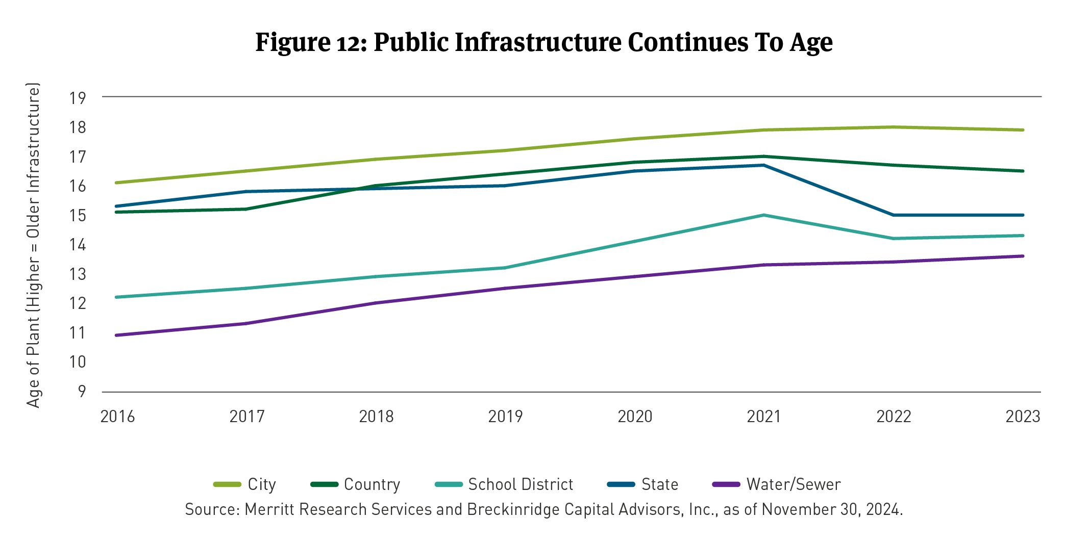Waning federal support and slower revenue growth at the state and local level portends more borrowing for capital needs. Inflation has also increased the cost of infrastructure projects, and most sectors still face a backlog of infrastructure needs (See Figure 12).28