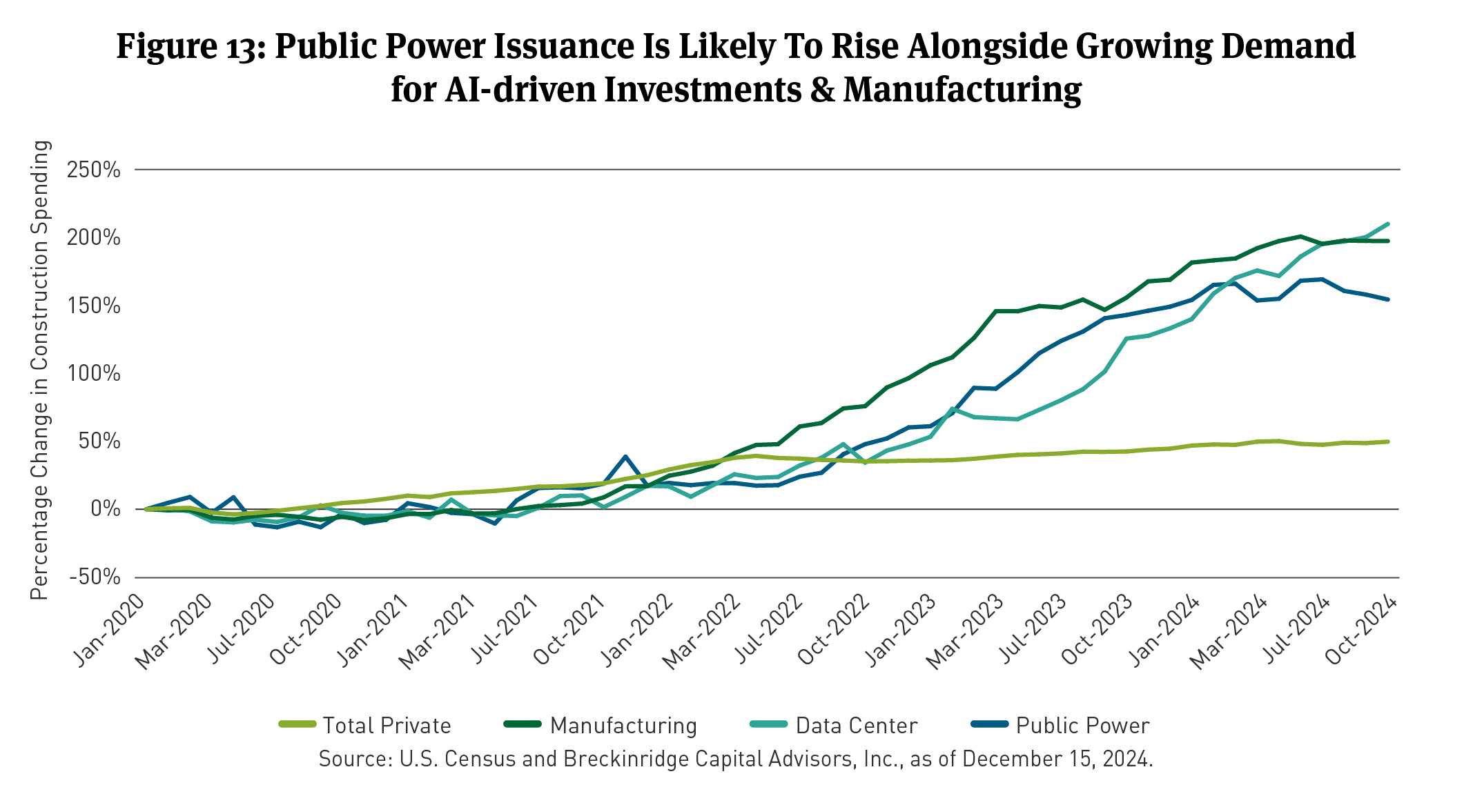 Climate change may also induce more borrowing. As noted in our November 21, 2024, article Heating Up: The Muni Market Inches Closer To Pricing Climate Risk, adaptation-related capital spending is likely to increase over the medium-term. Electric utilities seem especially likely to issue more debt. Demand in this sector is growing on account of clean energy mandates, artificial intelligence investments, and manufacturing-related projects. (See Figure 13).29