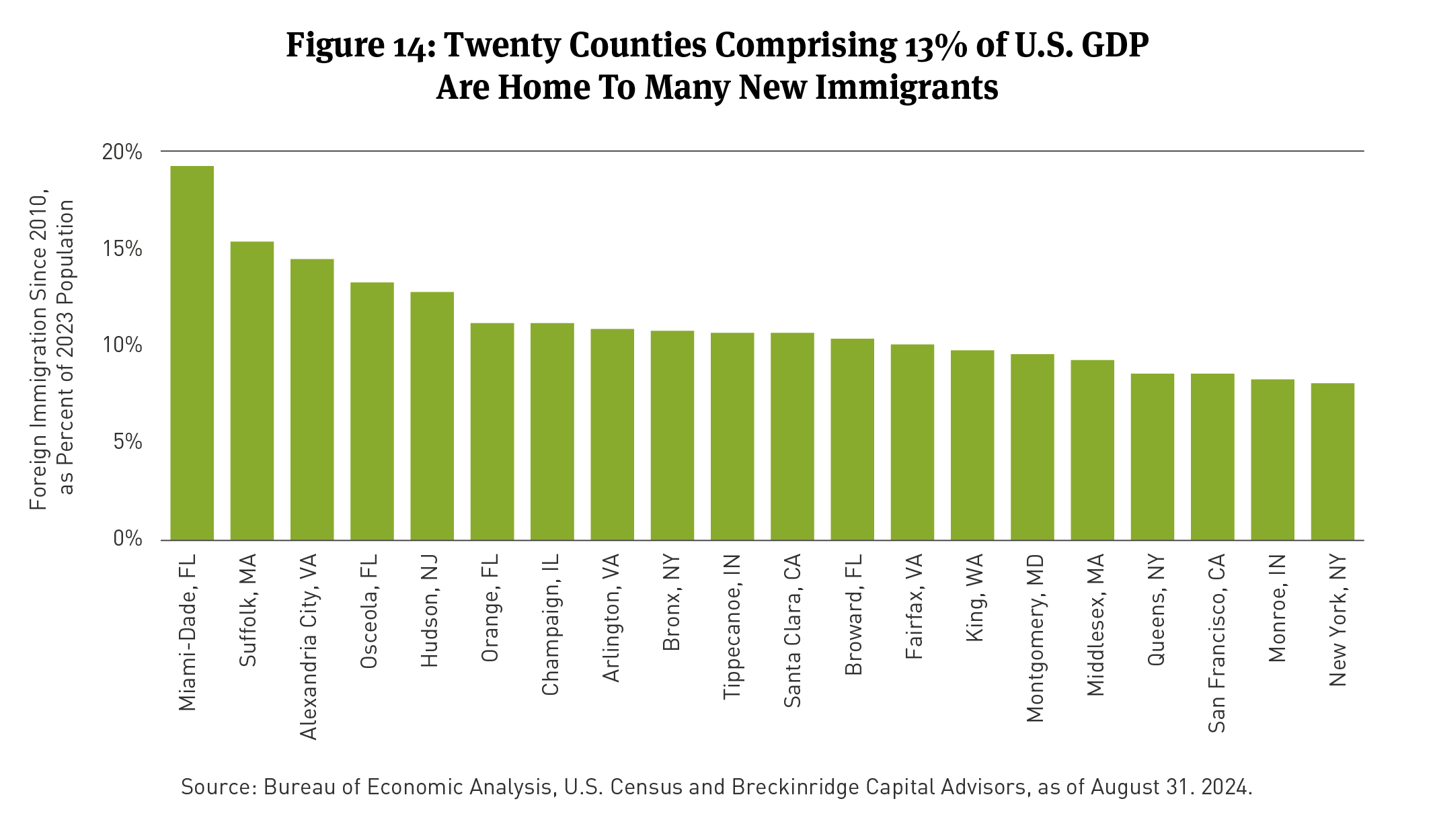 - Executive branch regulation. New immigration restrictions could shrink the pool of available workers for state and local employers and dampen the vibrancy of local economies (See Figure 14). Over time, these negatives would likely outweigh near-term savings from reduced social services spending. Tariffs could raise prices and might fall disproportionately on residents in lower-income areas.30