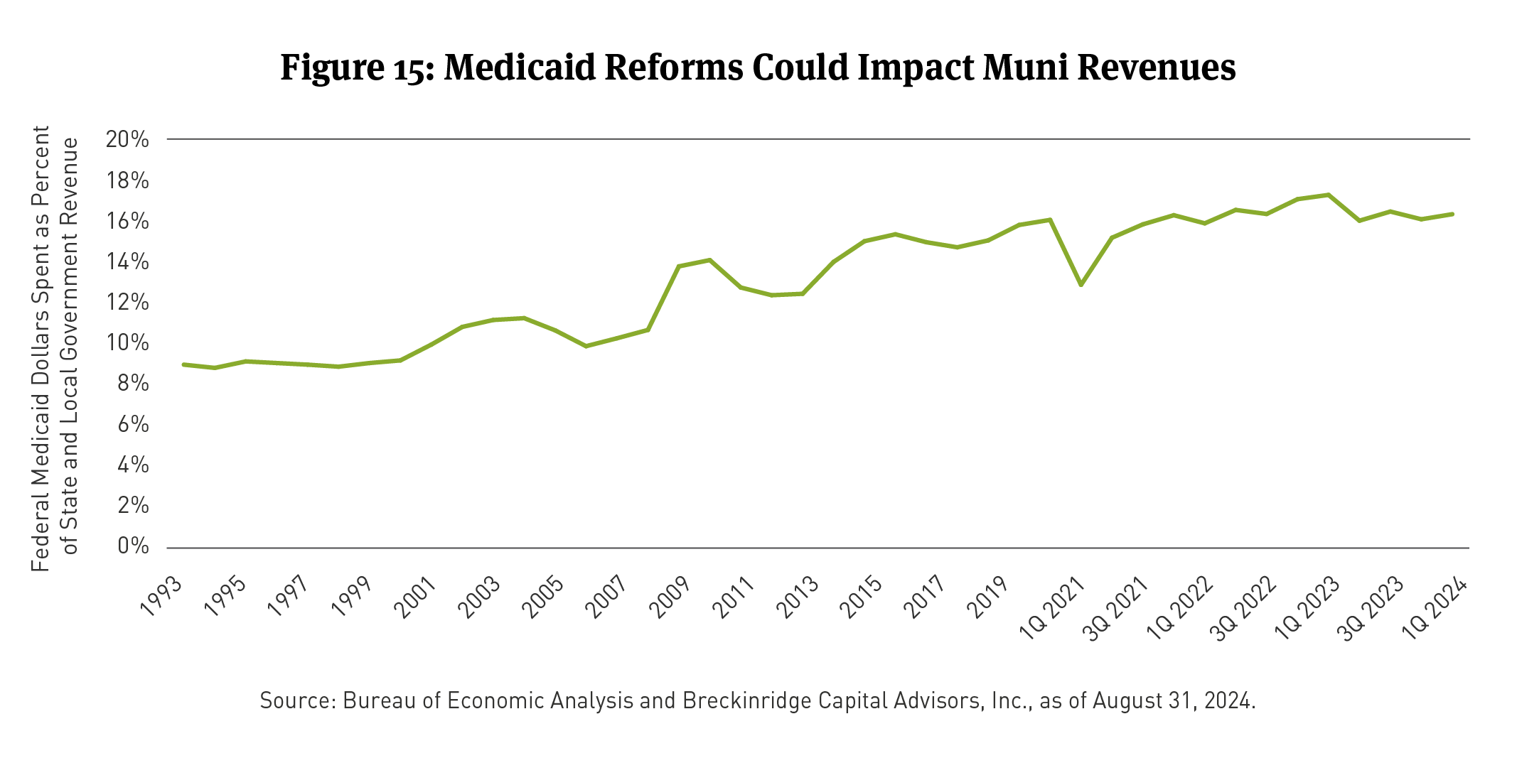 While the risk is low, a significant Medicaid reform poses the most obvious long-term credit risk to the market. Medicaid funding comprises a significant portion of state and local revenue (See Figure 15). It is often a large portion of hospitals’ revenue. Communities in which a hospital is a major employer can also suffer when Medicaid reimbursements fall (slowing employment growth). In 2017, using the reconciliation process, Republicans nearly passed a bill that would have converted Medicaid to a less generous per capita or block grant program.39 Similar proposals have been proffered by conservative think tanks. However, implementation may prove more challenging today given Republicans’ current coalition, which comprises less affluent voters who are generally supportive of the program.40