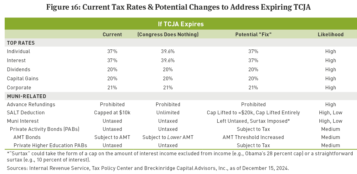 Nonetheless, tax reforms that implicate muni investments are likely to be considered throughout the year. The possibility that lawmakers tinker with the municipal tax exemption cannot be ruled out. There is momentum to restore the SALT deduction, at least in part.43 Figure 16 summarizes key tax considerations for muni investors. More thoughts on tax-related risk are available in our September 3, 2024, article, Election Outlook 2024: Tax Risk Rising and in the “technicals” section below.
