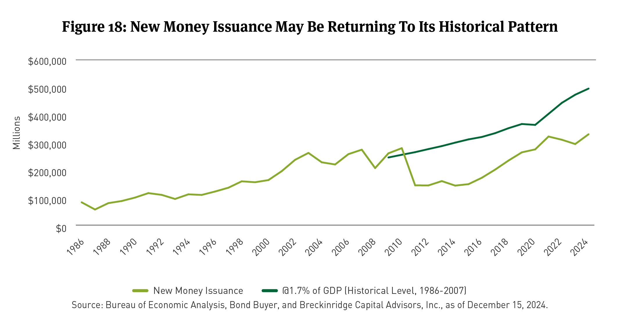 We anticipate increased issuance in 2025, driven mostly by an uptick in new money bonds. As noted above, fundamentals support this view. Issuers are likely to debt-finance more infrastructure, as unusually strong pandemic-era revenue performance wanes. Inflation has increased the cost of projects. Deferred maintenance remains a challenge in most sectors, and climate adaptation efforts will likely add to issuers’ capital plans. An uptick in supply in 2025 would build on 2024’s record $500+ billion in issuance, which hinted at a return to pre-2008 borrowing behavior (See Figure 18).44