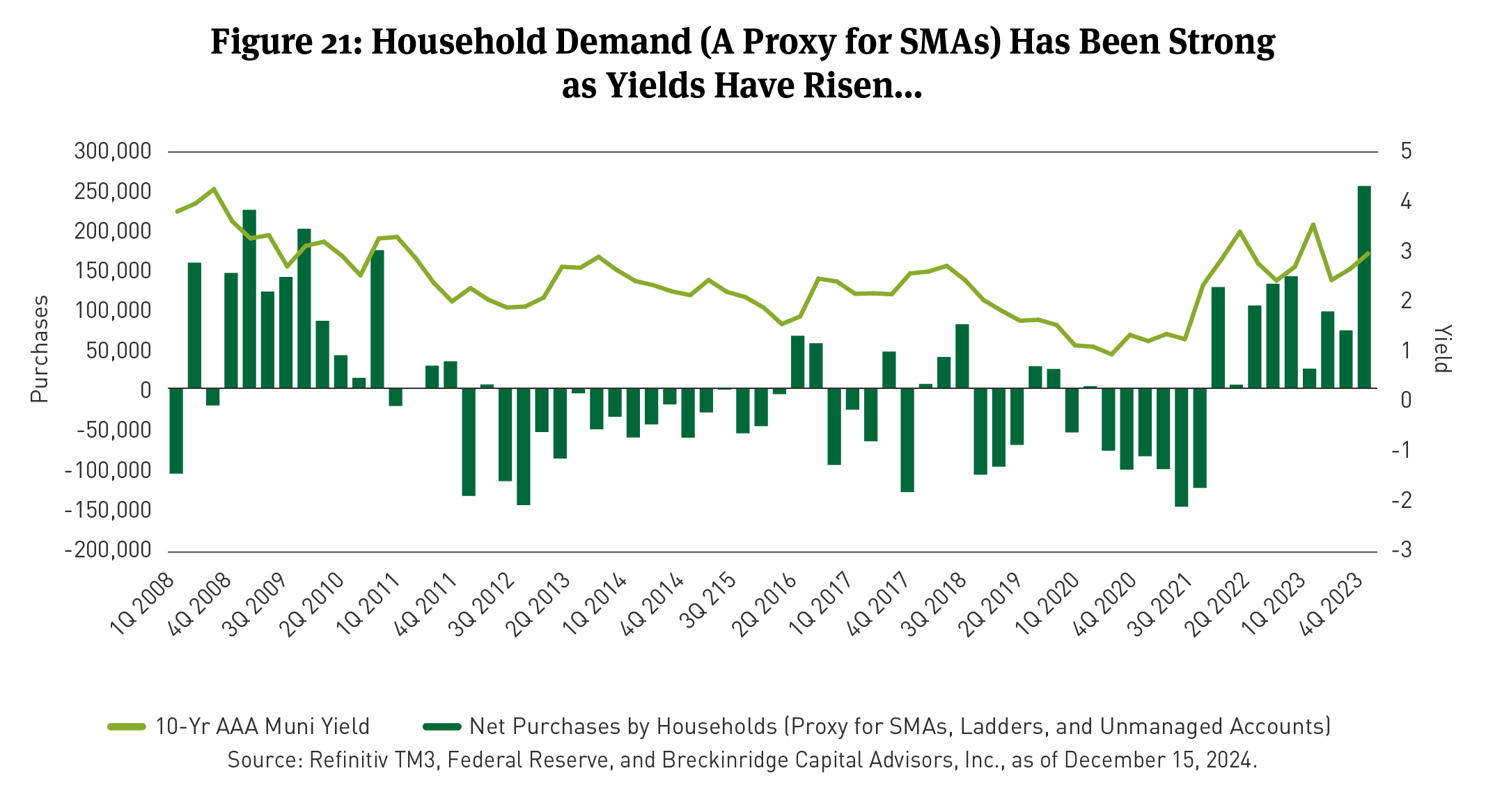 In 2024, the market grew more reliant on retail demand via separately managed accounts (SMAs), exchange-traded funds (ETFs), and mutual funds. Banks and insurers continued to be net sellers of municipal securities (See Figure 20).