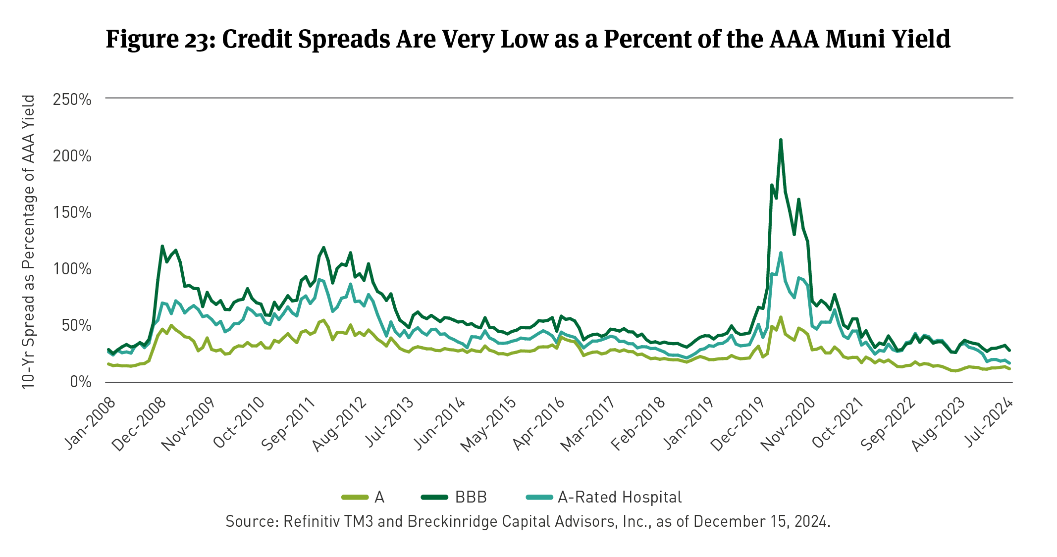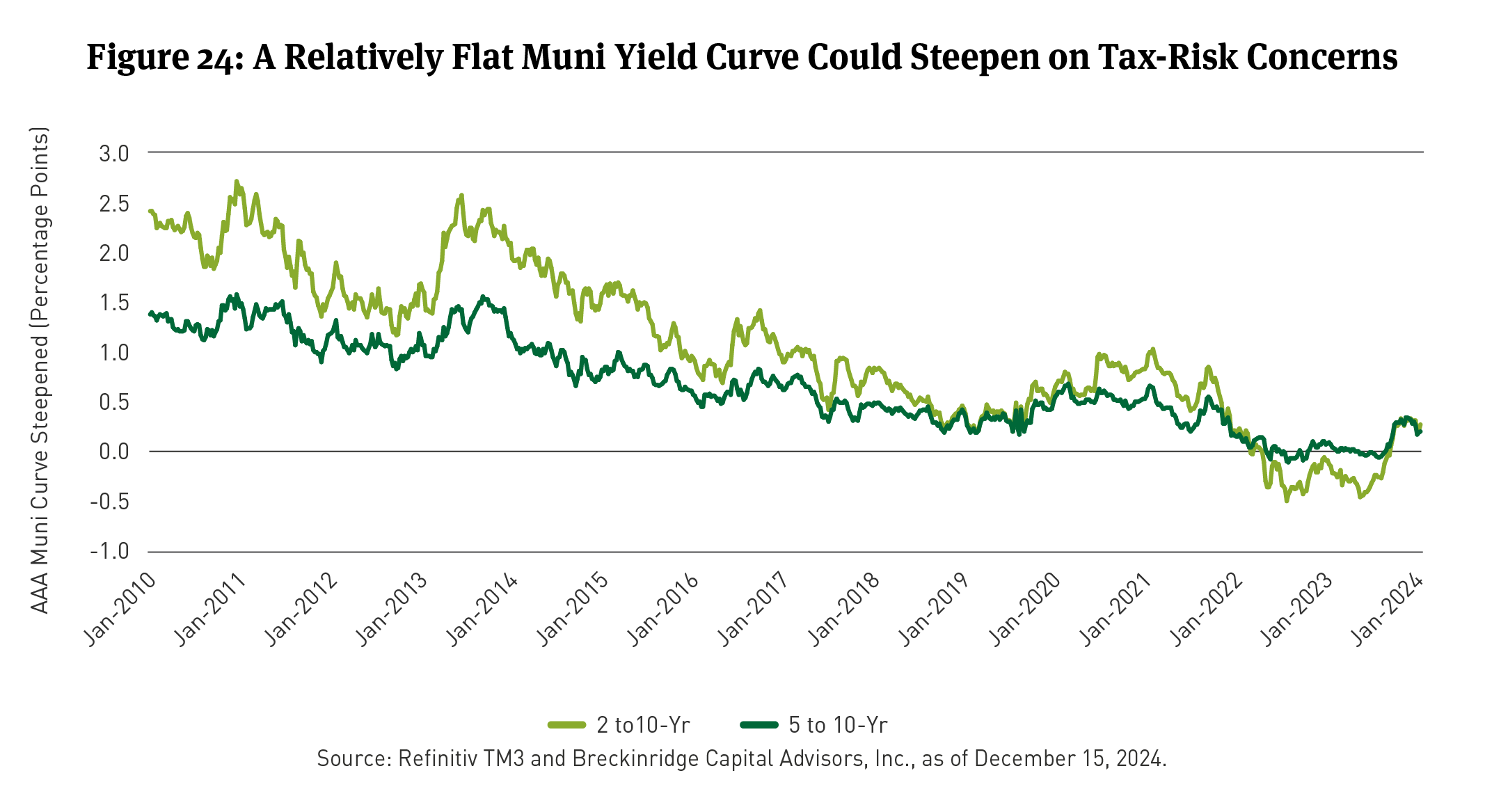 Entering 2025, credit spreads are low (See Figure 23) and the municipal yield curve is relatively flat (See Figure 24).