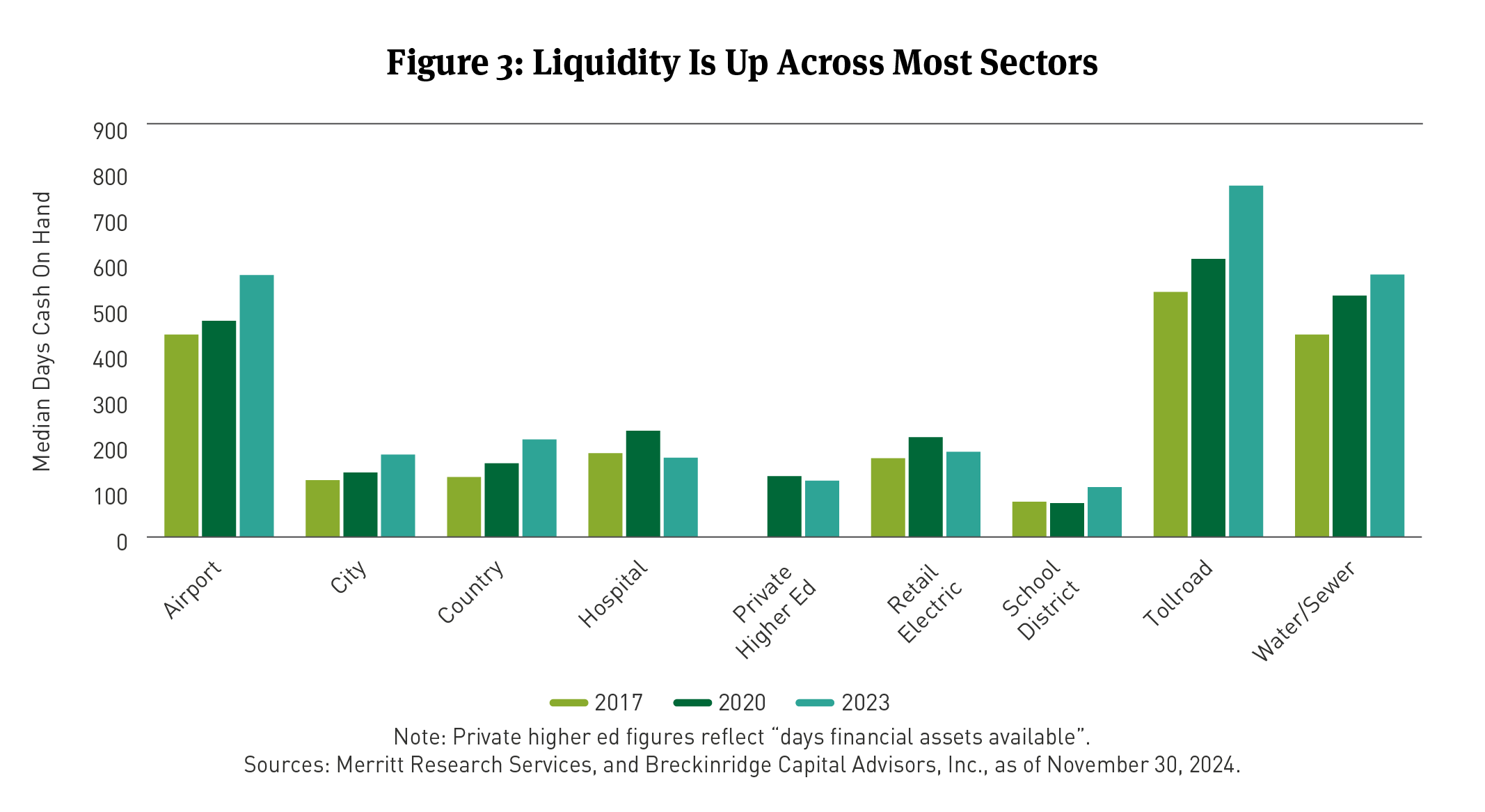 Liquidity is up across most major sectors. Tax-backed issuers like cities, counties, and school districts are particularly liquid (See Figure 3). State reserve balances (not included below) are expected to reach a record 13 percent of general fund expenditures when the books are closed for fiscal year 2024 (FY 24).6