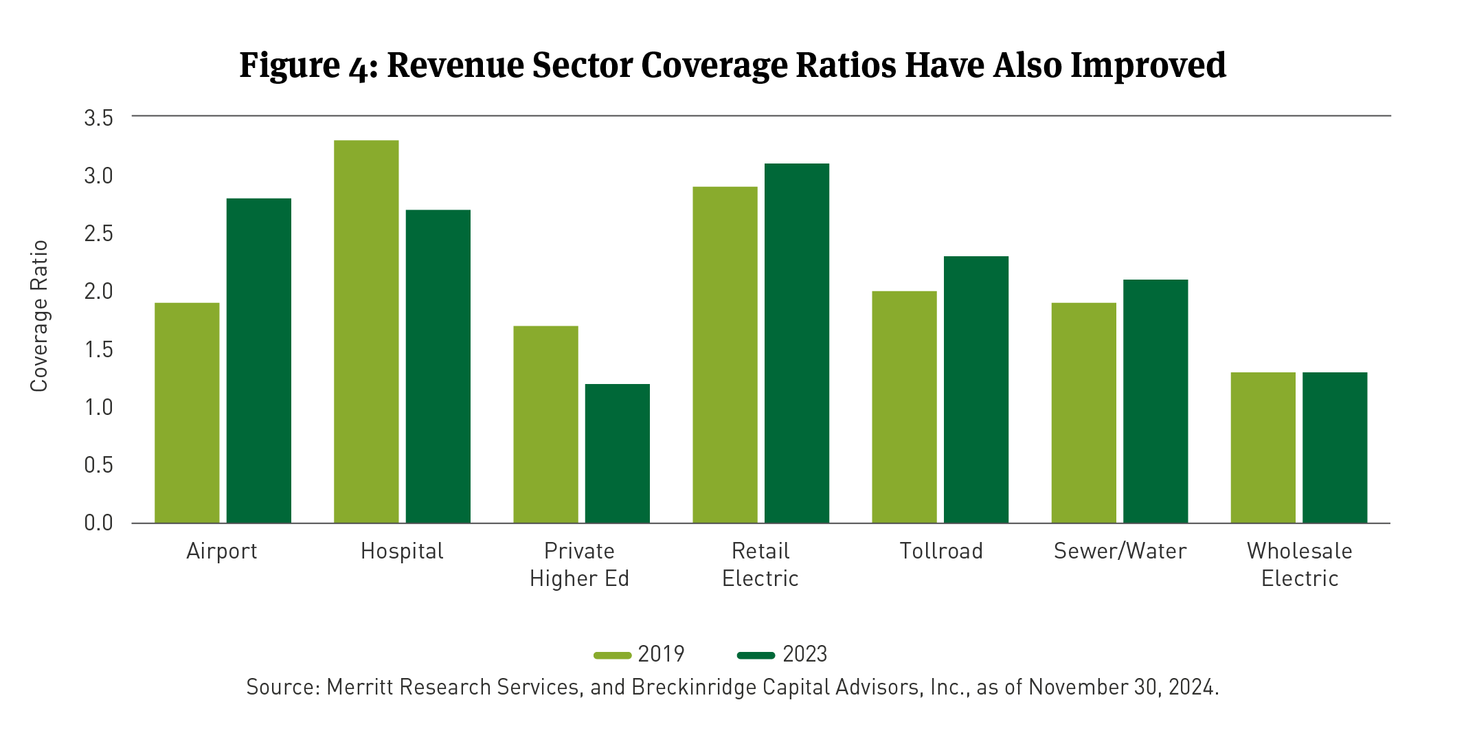 - Coverage ratios have improved. Water, sewer, and electric utility debt service coverage ratios are better than they were before the pandemic (See Figure 4). Transportation sector coverage is also better. Notably, toll road traffic in 2024 was 106 percent of its 2019 level.7 Airport revenue-passenger-miles were up 5 percent through August 2024 compared to the same period in 2023.8