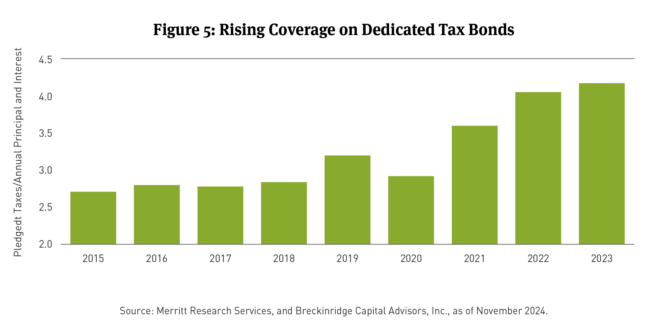- Dedicated tax coverage also looks healthy. Solid consumer spending amid several years of rising prices has increased pledged taxes relative to principal and interest payments (See Figure 5).9 Even mass transit bonds backed by dedicated taxes are now in better shape.10