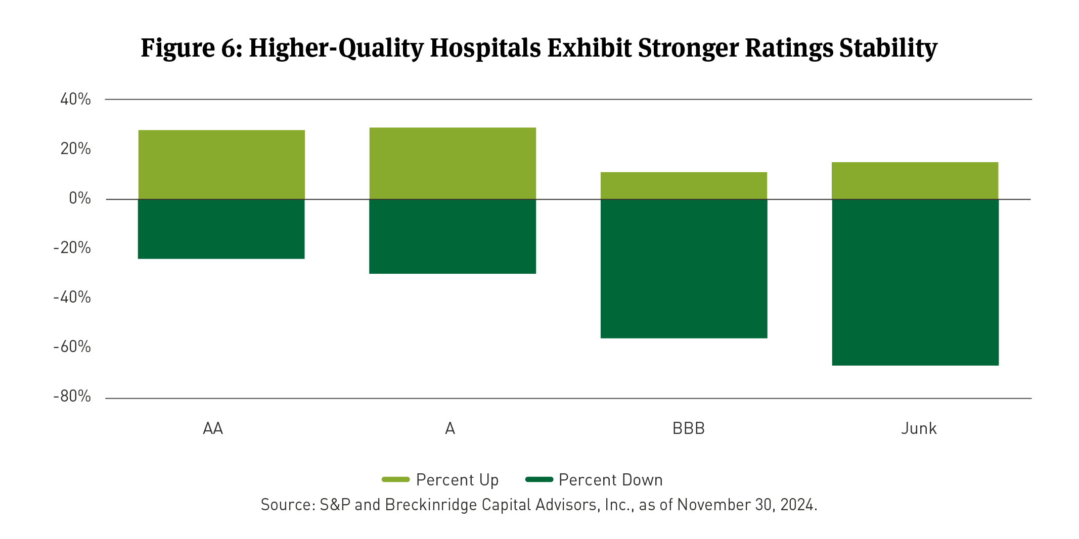- The hospital sector is more stable. Nationally, hospital margins exceeded 4 percent year-to-date (YTD) through October 2024, up from 2 percent over the same period in 2023.11 Higher-rated hospital names exhibited more ratings stability in 2024, a pattern we believe will continue in 2025 (See Figure 6).12 Higher-rated systems exhibit stronger service area market shares, are less exposed to government payers that might suffer federal budget cuts (Medicare and Medicaid), and better ability to attract and retain staff.