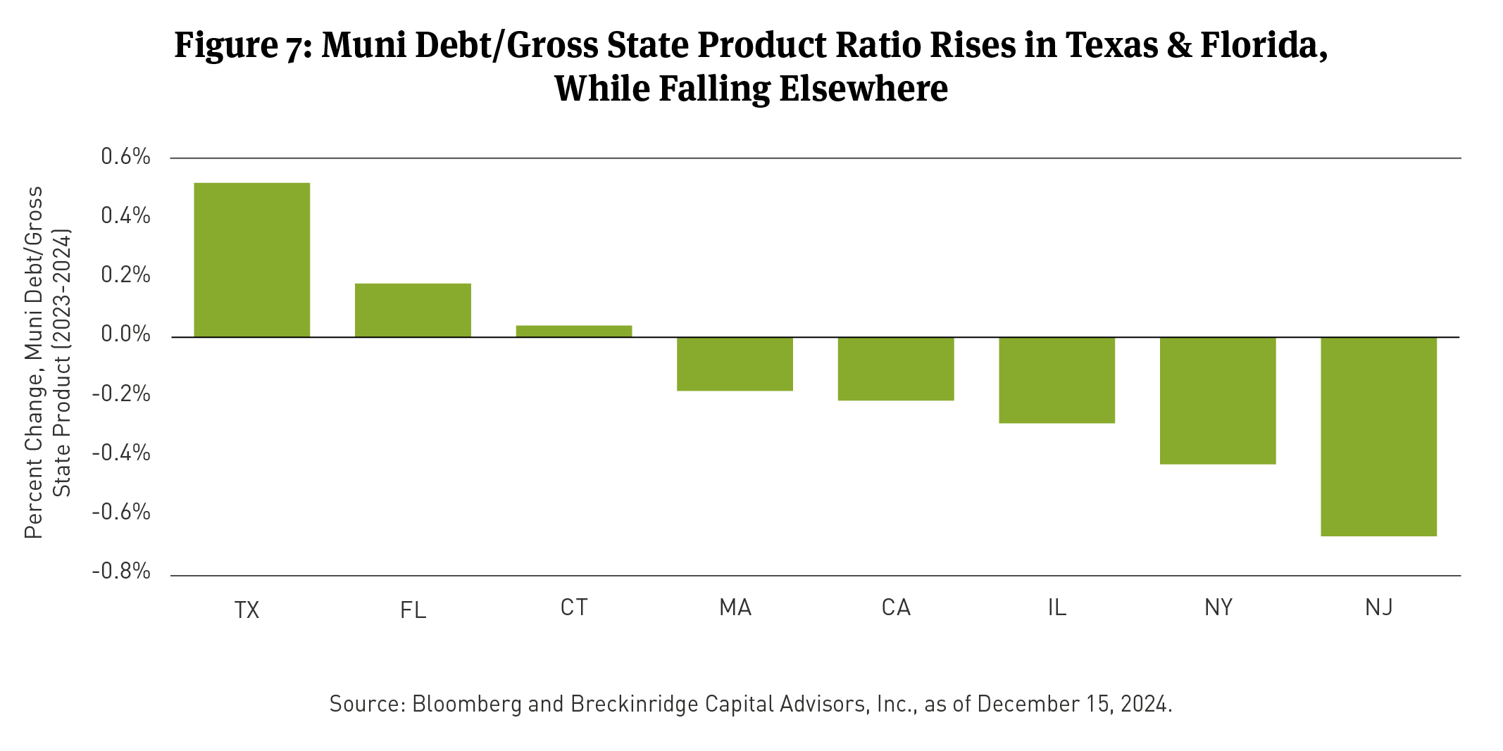 - The muni debt burden continues to fall in most states. The municipal bond market grew by 4 percent in 2024 to $4.2 trillion.13 Record issuance contributed to the increase.14 However, economic growth outpaced the net increase in debt in 29 states, including several “specialty” states known for above average debt burdens (See Figure 7). Economically healthy, fast-growing areas of the country are leading the surge in new issuance (e.g., FL and TX).