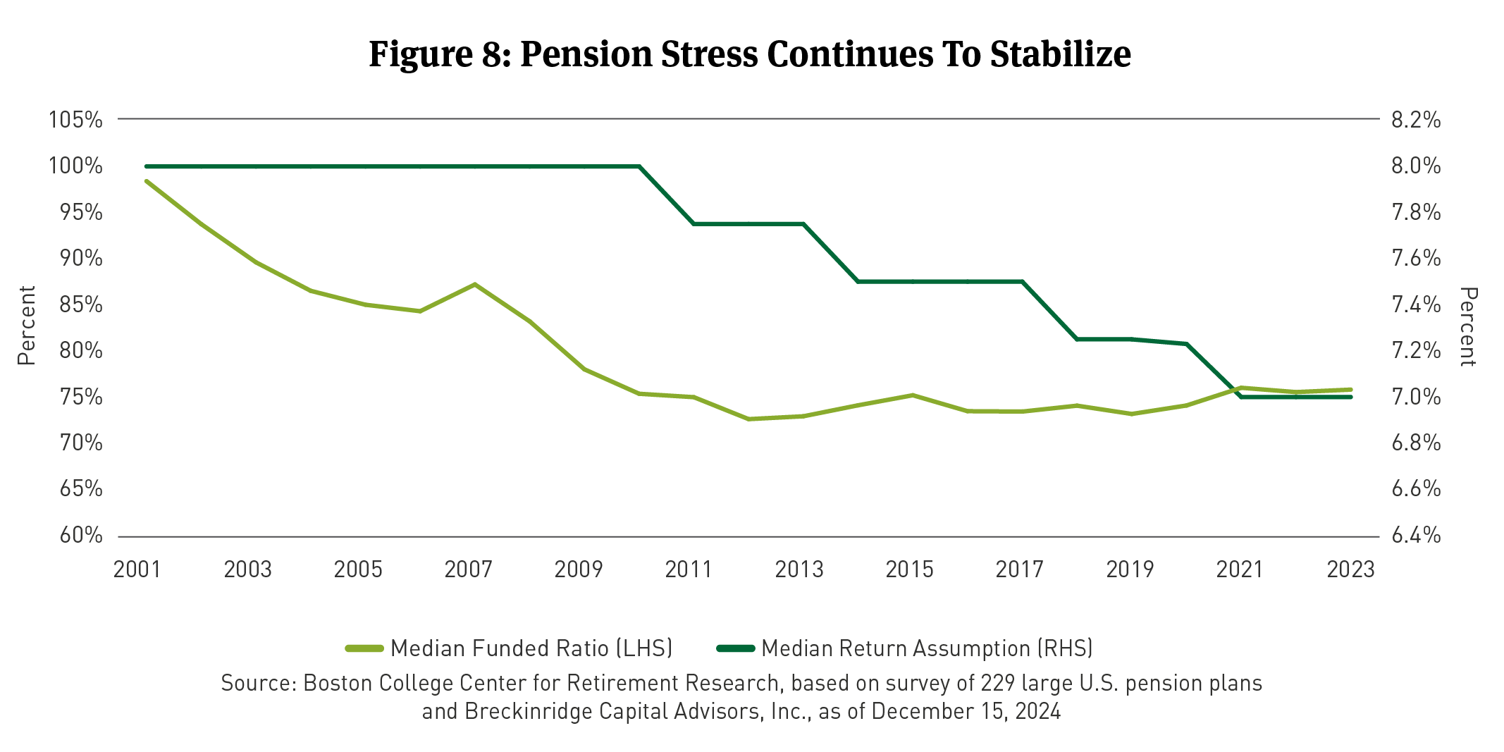 - Falling pension debts. Unfunded public pension liabilities have declined by $3 trillion since 2020.15 Higher interest rates and a fast-rising stock market have enabled public funds to lower investment-return assumptions, while increasing their funding ratios (See Figure 8). Some plans remain meaningfully stressed, and it is likely that some governments will increase cost-of-living adjustments in budget negotiations in 2025.16 But for most issuers, contribution levels in the near-term are unlikely to change meaningfully.