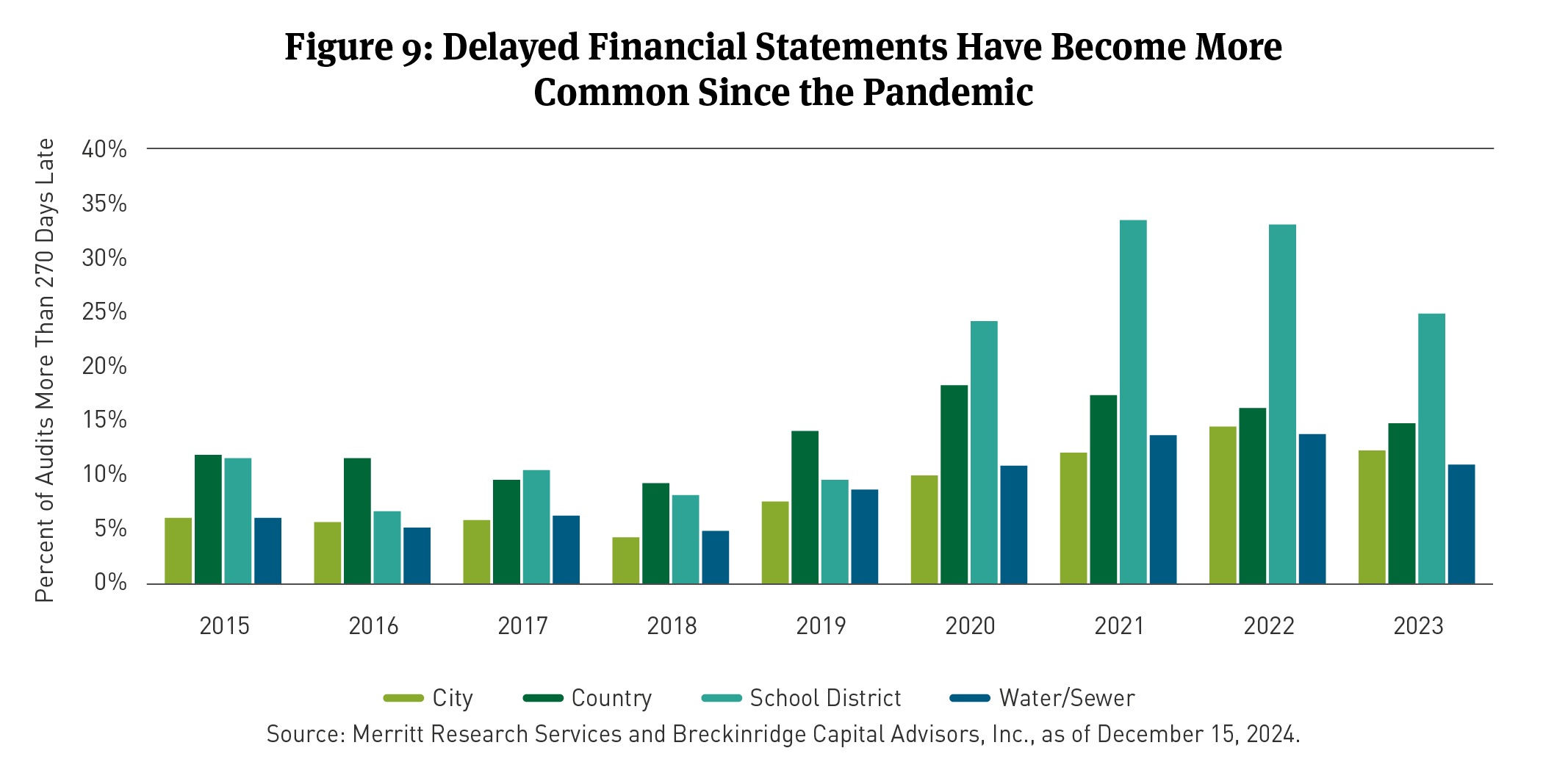 Stale financial audits have become more prevalent since the pandemic (See Figure 9) and driven a four-fold increase in ratings withdrawals from S&P since 2018.17 The current shortage of public finance professionals may exacerbate the problem in the near-term.18