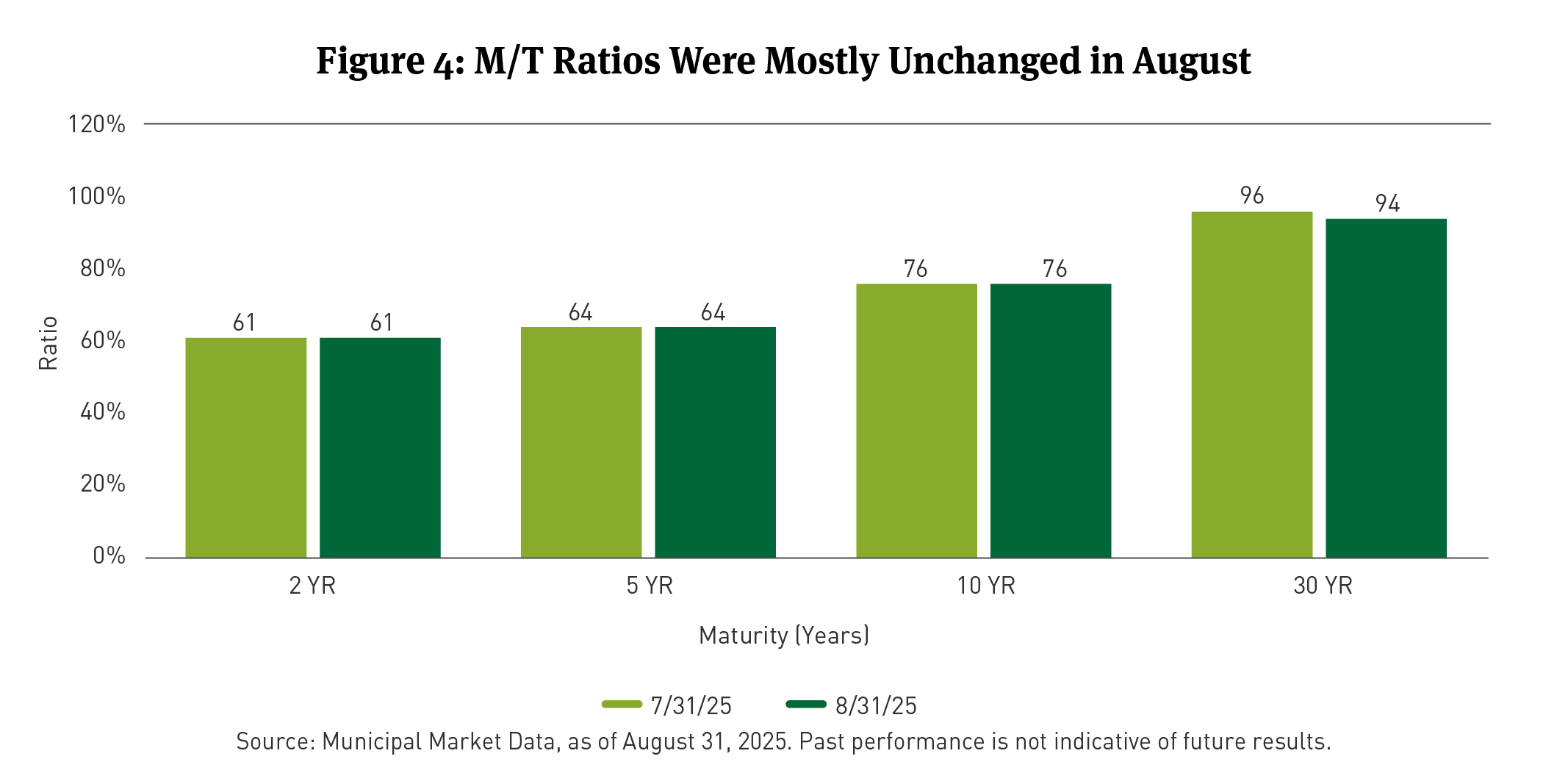 [1] The Municipal/Treasury (M/T) ratio compare yields of municipals bonds with those of U.S. Treasury bonds of the same maturity. M/T ratios can show the relative value of municipal bonds compared with taxable bonds, by indicating when yields for municipal bonds exceed the after-tax yields on taxable bonds. M/T ratio data is per Municipal Market Data, as of August 31, 2025.