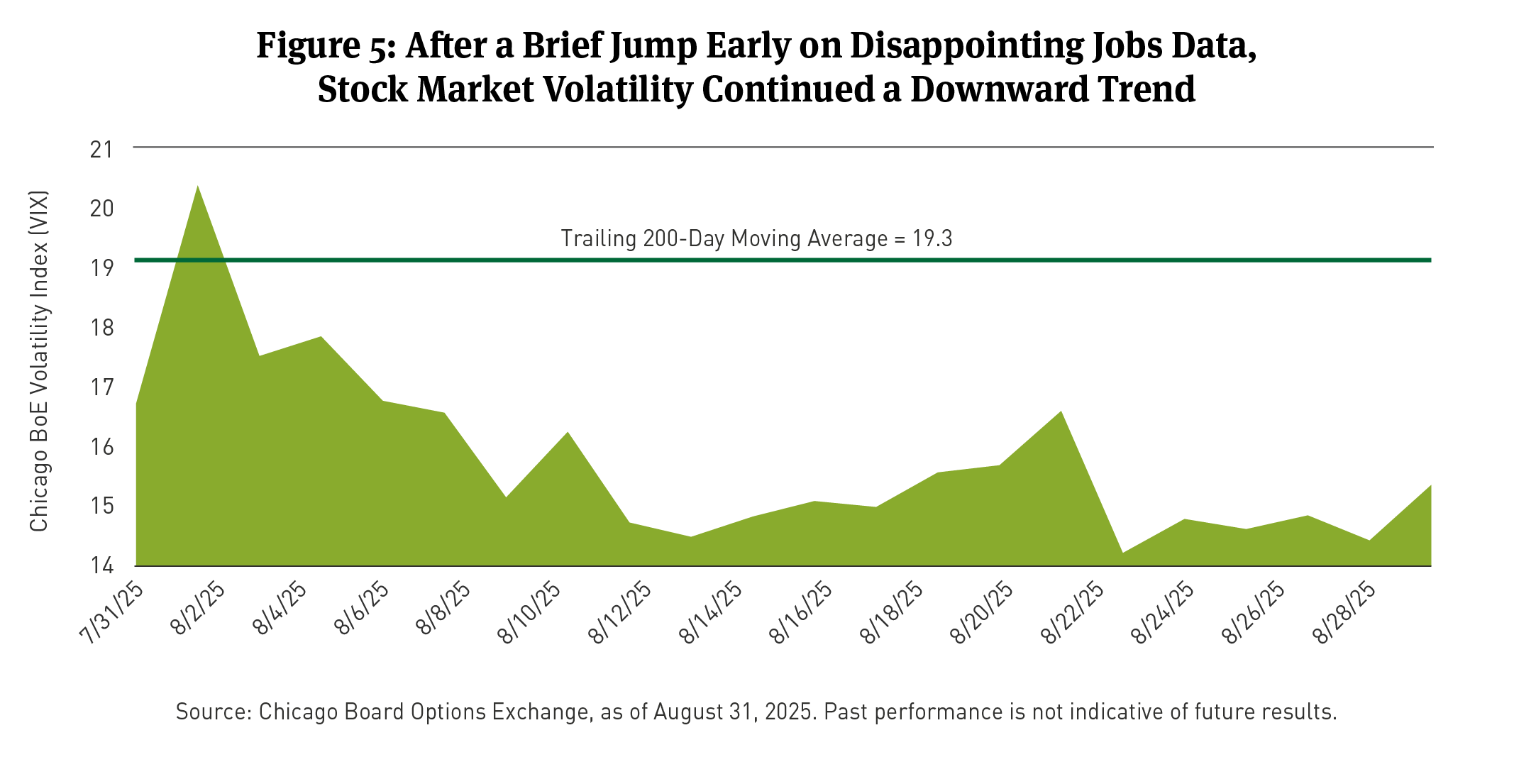 The S&P 500 Index returned 2.03 percent in August 2025, marking a positive month for U.S. equities. The VIX Index, a measure of market volatility, experienced a decline, ending the month below the 200-day moving average, indicating a reduction in market uncertainty and investor anxiety (See Figure 5).