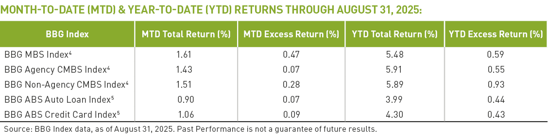 - Securitized Trends: Mortgage-backed securities (MBS) returns were strong at 1.61 percent, while Asset-backed securities (ABS) returns were favorable, with Auto Loans at 0.90 percent.