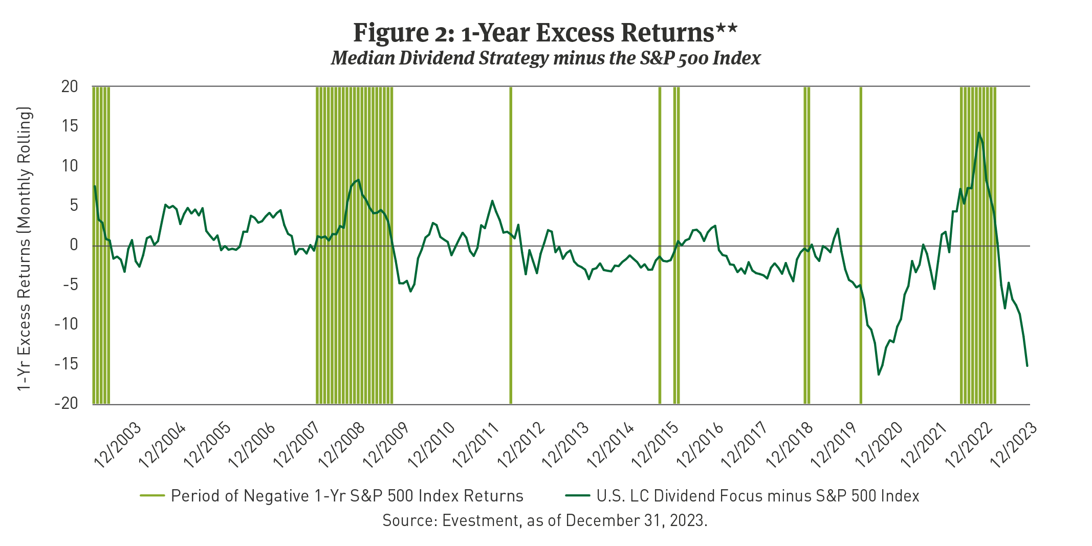 In addition to rewarding investors with attractive risk-adjusted returns, dividend-focused strategies have tended to exhibit positive relative performance in down markets, particularly during more severe economic events and periods of longer drawdowns, outperforming the broader market (See Figure 2).