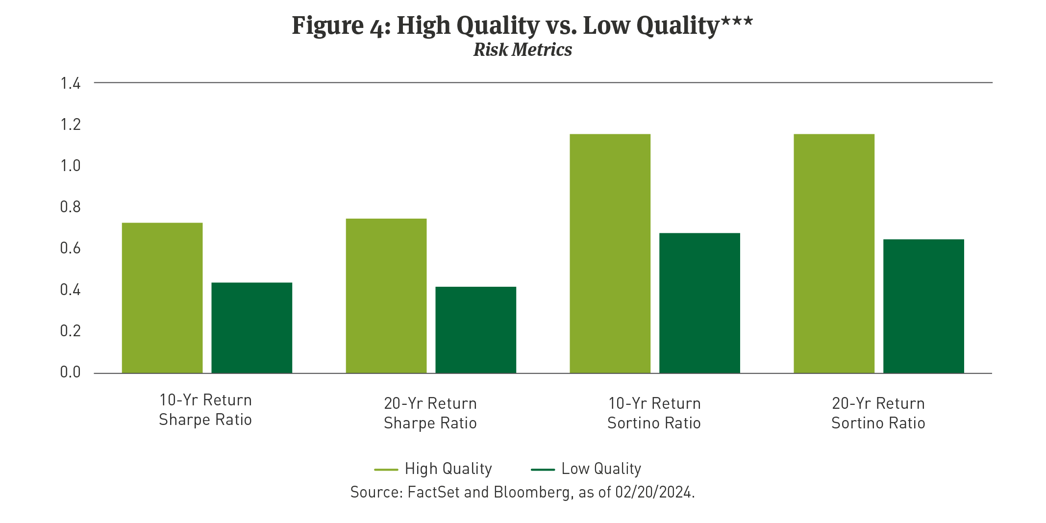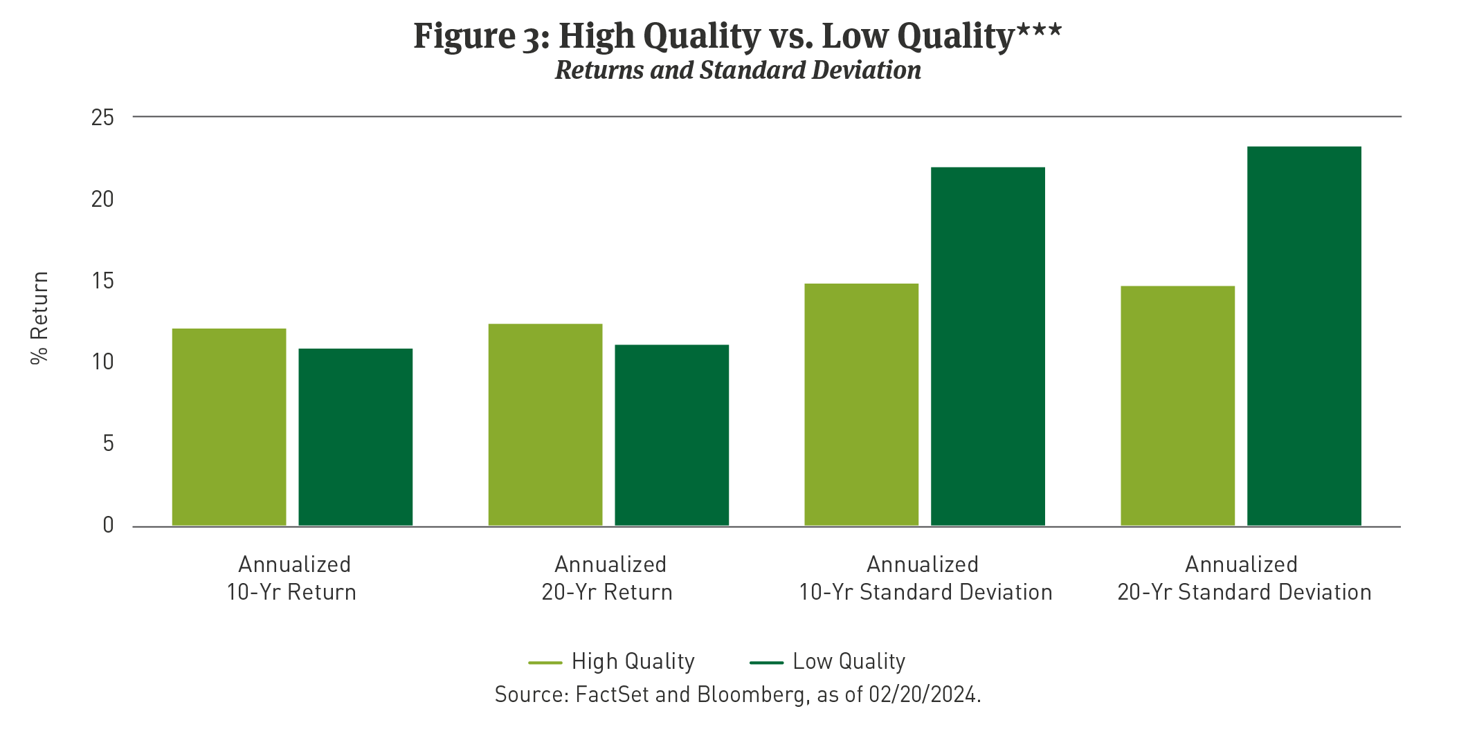 *** Past performance is not indicative of future results. Calculations for Figure 3 and Figure 4 were conducted on Factset using Bloomberg Monthly Returns data. High Quality is defined as the top quintile of S&P 500 Index companies that have the following characteristics: strong profitability, low leverage, and low variability in sales/earnings and cash flows. Low quality is defined as companies that are bottom quintile when screened on the same characteristics.