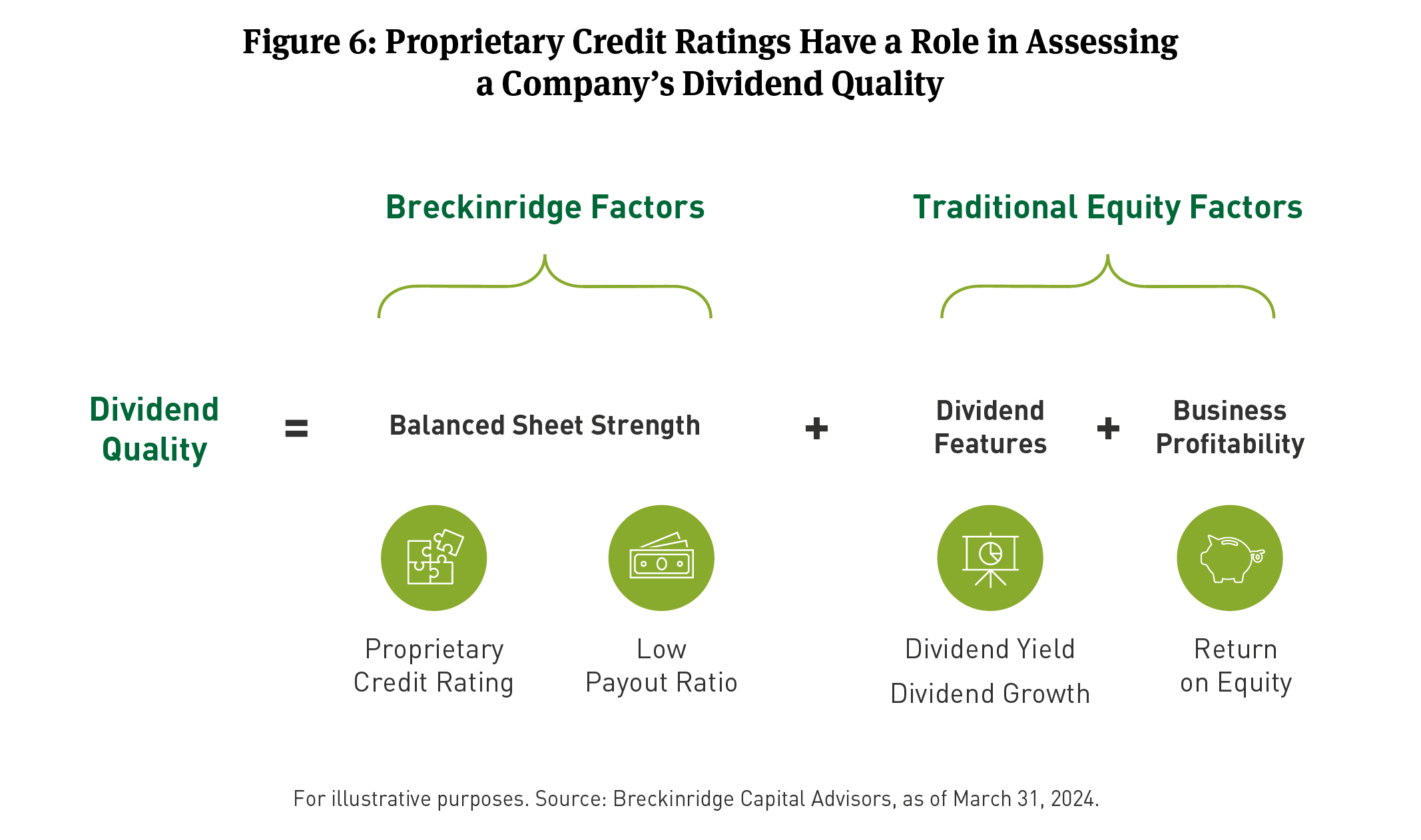 Additionally, to deliver exposure to companies that exhibit high dividend quality attributes, it is imperative to integrate a measure of financial robustness. We accomplish that with the addition of our proprietary credit rating, which includes a comprehensive forward-looking assessment of the financial strength and management of companies being considered for inclusion in the strategy (See Figure 6).