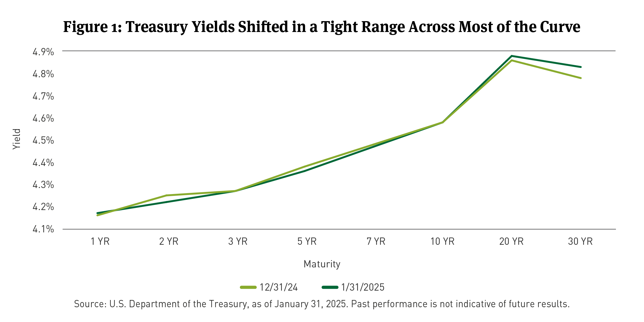 Shifts in Treasury yields during January included a decline for maturities 10 years and shorter, and an increase for maturities with longer maturities (See Figure 1). Yields by the end of January were lower for 2-, 5-, and 10-year maturities by 4, 5, and 3bps, respectively. The yield for the 30-year Treasury was 1bp higher.