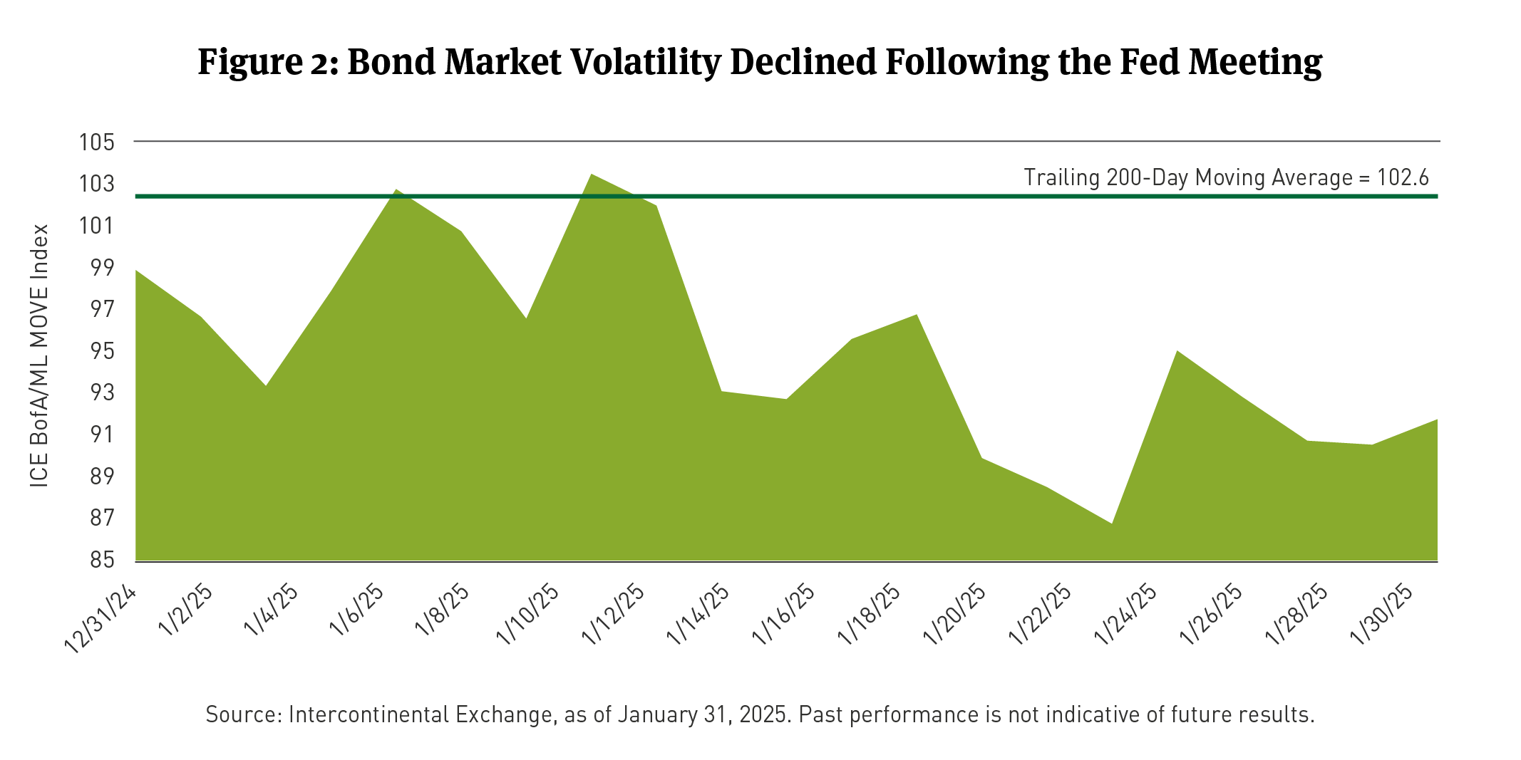 On the other hand, expectations for volatility, as measured by the Intercontinental (ICE) Bank of America/Merrill Lynch Option Volatility Estimate (MOVE) Index, portrayed a greater sense of concern among bond investors (See Figure 2).