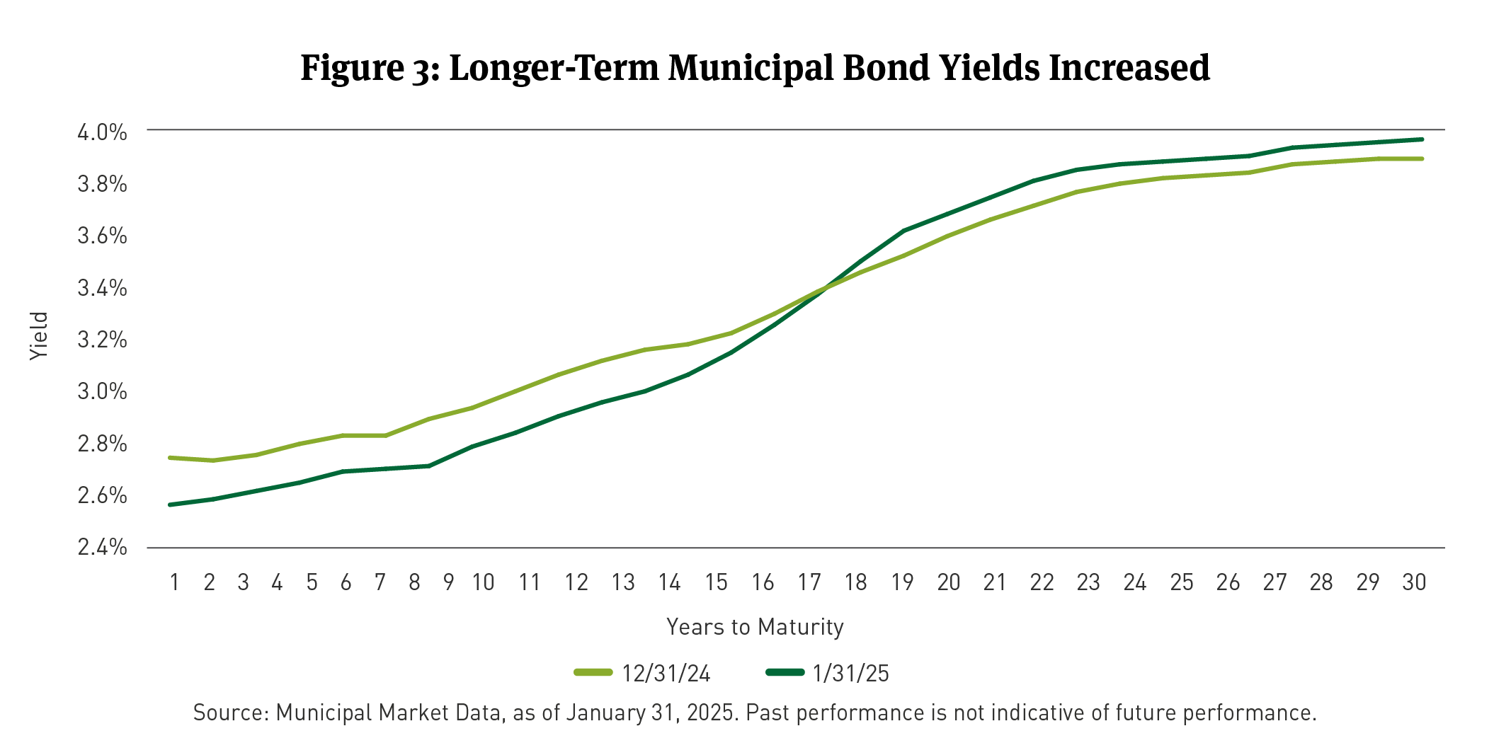 - Municipal Market Rates and Technicals: Municipal yields fell from 15 years and shorter but rose for longer maturities. [2] The Bloomberg (BBG) Short/Intermediate (1-10) Municipal Bond Index [3] (the Municipal Index) outperformed the BBG U.S. Treasury Index [4] (the Treasury Index). January bond issuance was higher than the same month in 2024. [5]