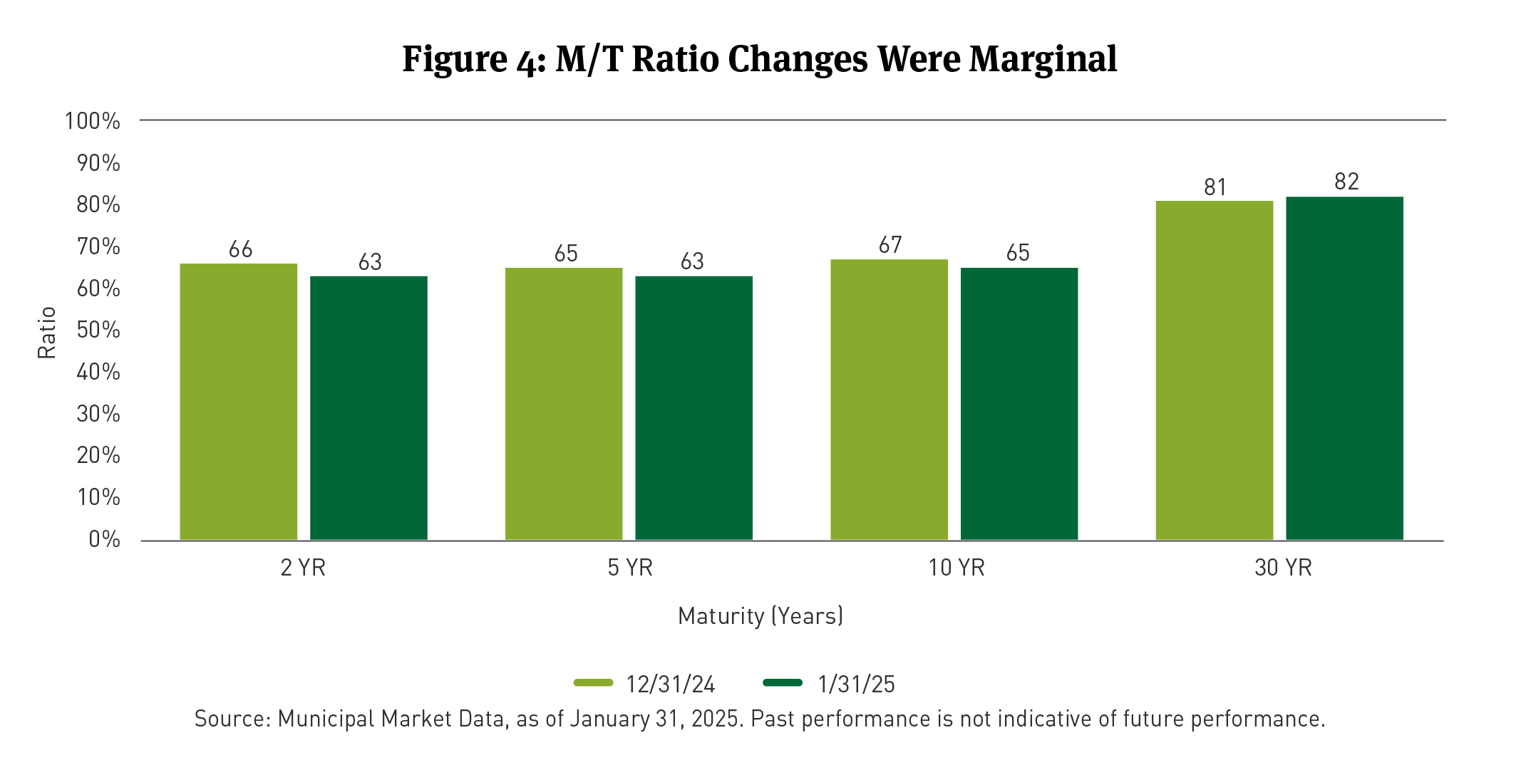 The Municipal Bond Index gained 0.67 percent in January compared with the Treasury Index’s 0.52 percent gain. During January, municipal yields fell by 11, 8, and 7bps, respectively, for 2-, 5-, and 10-year maturities and gained 9bps at 30-years (See Figure 4).