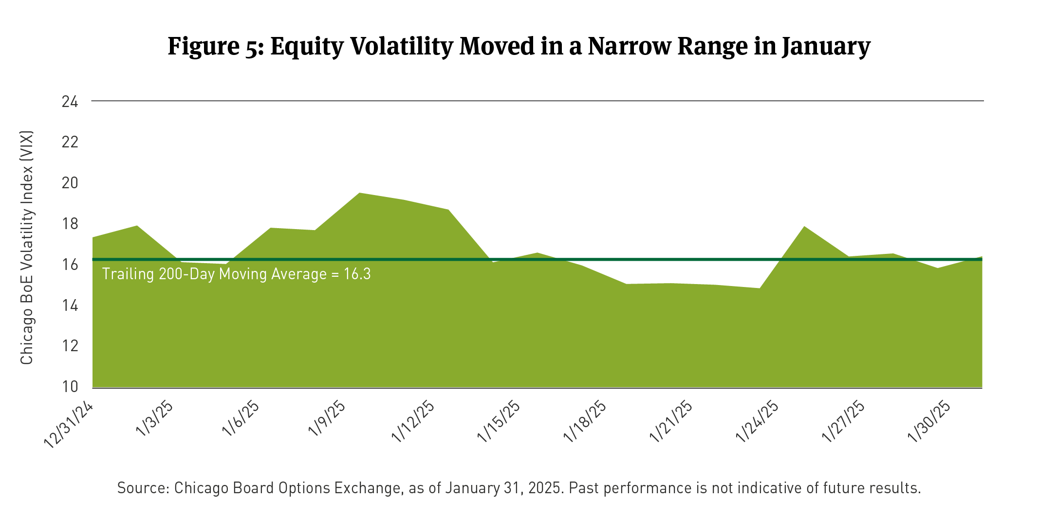 The Chicago Board Options Exchange (BoE) Volatility Index16 (VIX) moved in a fairly narrow range during the month (See Figure 5).