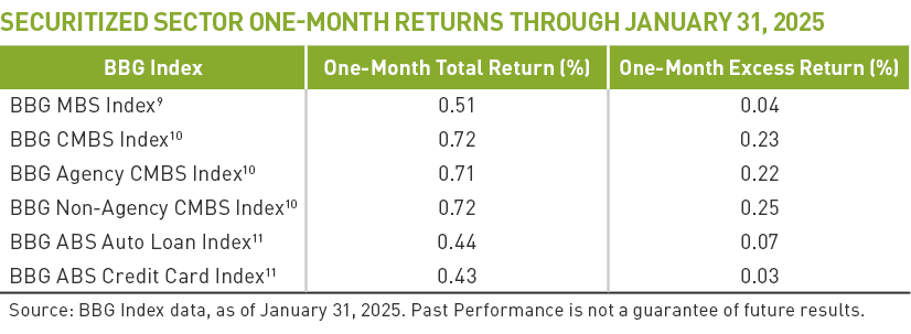 - Securitized Trends: BBG data showed total returns for mortgage-backed securities (MBS) and Asset-Backed Securities (ABS) were positive, with Agency and Non-agency Commercial MBS turning in the strongest performance. Securitized bonds excess returns were positive.