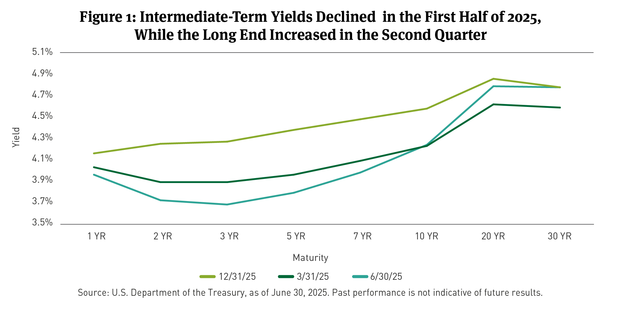 - U.S. Treasury Curve: Treasury yields fell in June and steepened for the quarter, with yields falling in the 1- to 10-year range and increasing beyond 10 years.