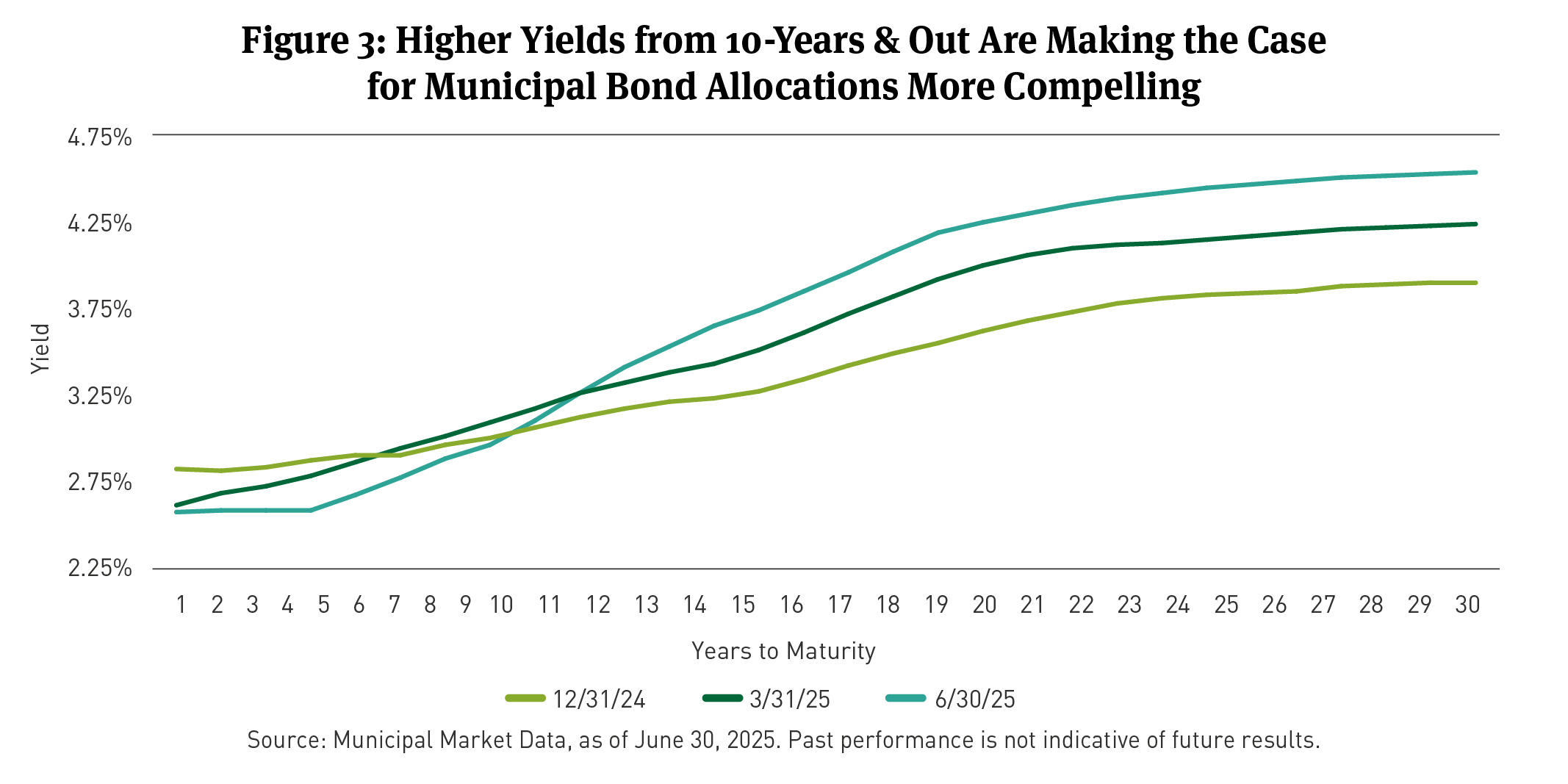 Despite the surge, municipal bonds, as measured by the BBG Short/Intermediate Municipal Bond Index, posted a positive return at 0.94 percent in June, 1.33 percent for the quarter ended June 30, and closed the first half of 2025 up 1.82 percent.