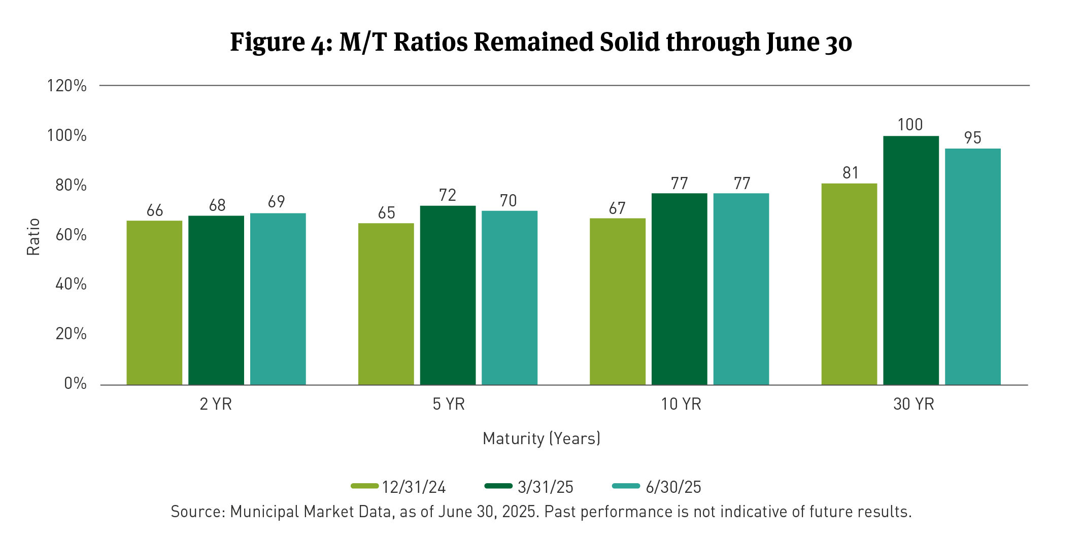 Yields for 2-, 5-, 10-, and 30-year municipal bonds fell 17, 16, 10, and 2bps, respectively, as the yield curve steepened (See Figure 3). For the quarter and YTD through June 30, 2- and 5-year yields fell, while 10- and 30-year yields increased. M/T Ratios were steady at the upper end of the 2025 range (See Figure 4).