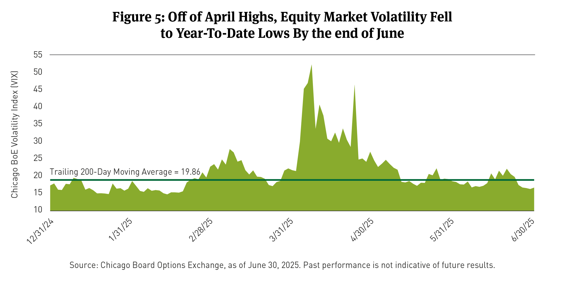 The S&P Index earned a positive monthly return of 5.1 percent in June, 10.6 in the quarter ended June 30, and is up about 24 percent since the low level reached on April 8. The Chicago Board Options Exchange (BoE) Volatility Index14 (VIX) declined (See Figure 5). The 200-day moving average was steady over the month.
