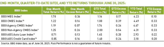 During June, MBS and ABS total and excess returns were positive.