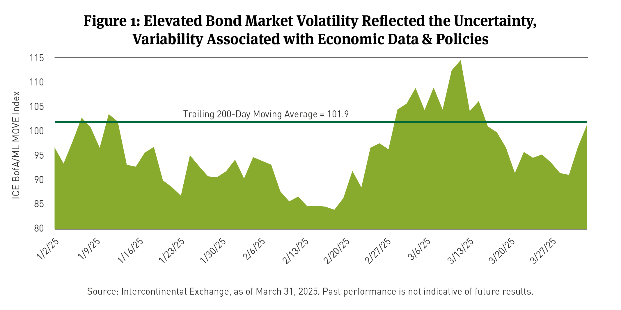 Cross currents from sometimes conflicting economic readings and policy announcements buffeted the markets, often leaving investors uncertain of which way to turn. Bond market volatility was elevated, especially through March, as measured by the Intercontinental (ICE) Bank of America/Merrill Lynch Option Volatility Estimate (MOVE) Index.6 (See Figure 1).