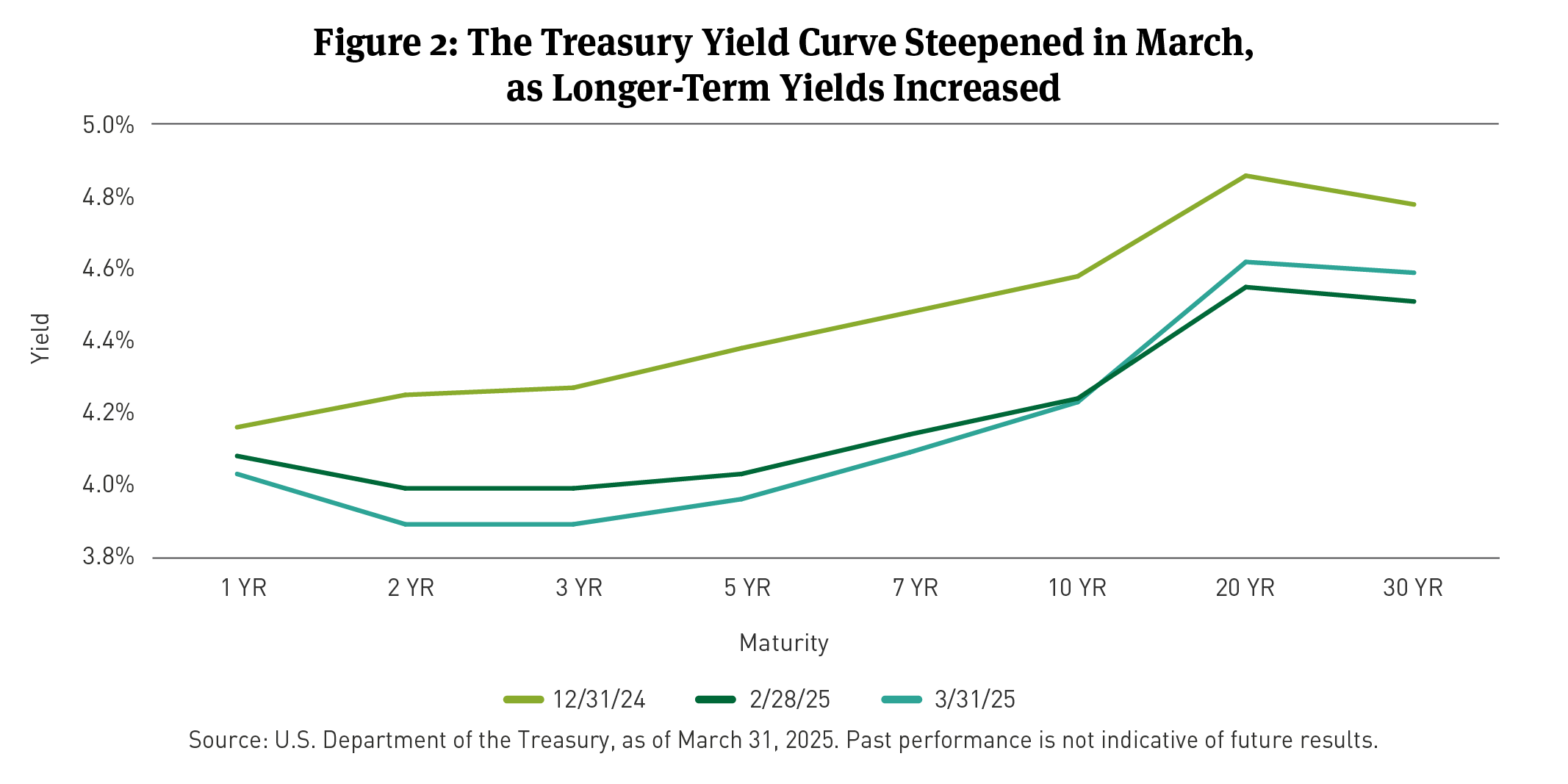 By the end of the month, Treasury yields were lower for 2- and 5-year Treasuries by 11 and 7bps, respectively. The 10-year Treasury yield was unchanged. The 30-year yield was 8bps higher. For the quarter ended March 31, 2025, 2-, 5-, 10-, and 30-year Treasury yields were 36, 43, 36, and 21bps lower. (See Figure 2).