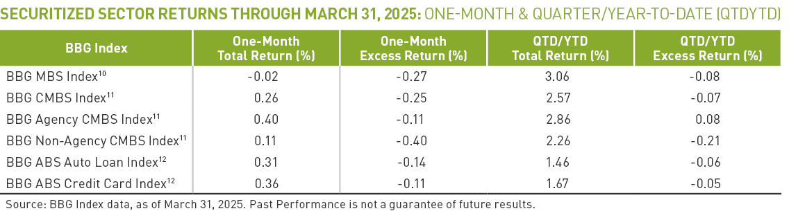 With the exception of the residential MBS sector, which was down 0.02 percent in March, all MBS and ABS sectors delivered positive total returns for the month and quarter ended March 31, 2025, according to BBG data. Excess returns for the same periods were negative across the sectors.
