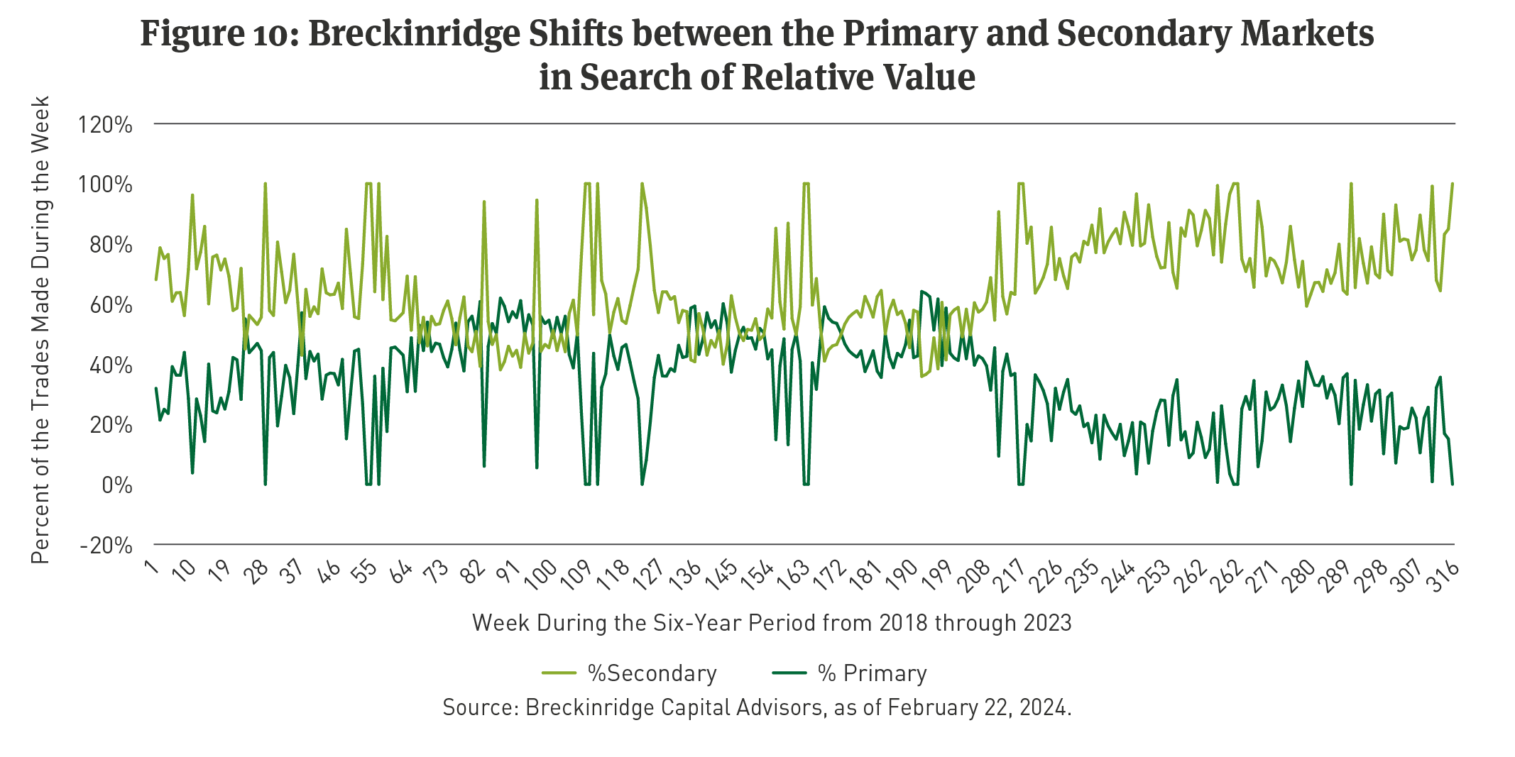 [5] The chart depicts the percentage on a dollar basis of the total volume of trades for all Breckinridge tax-exempt bond strategies completed weekly on the primary market and the secondary market from January 2, 2018 through December 31, 2023. The source of the data was Breckinridge’s trading records.