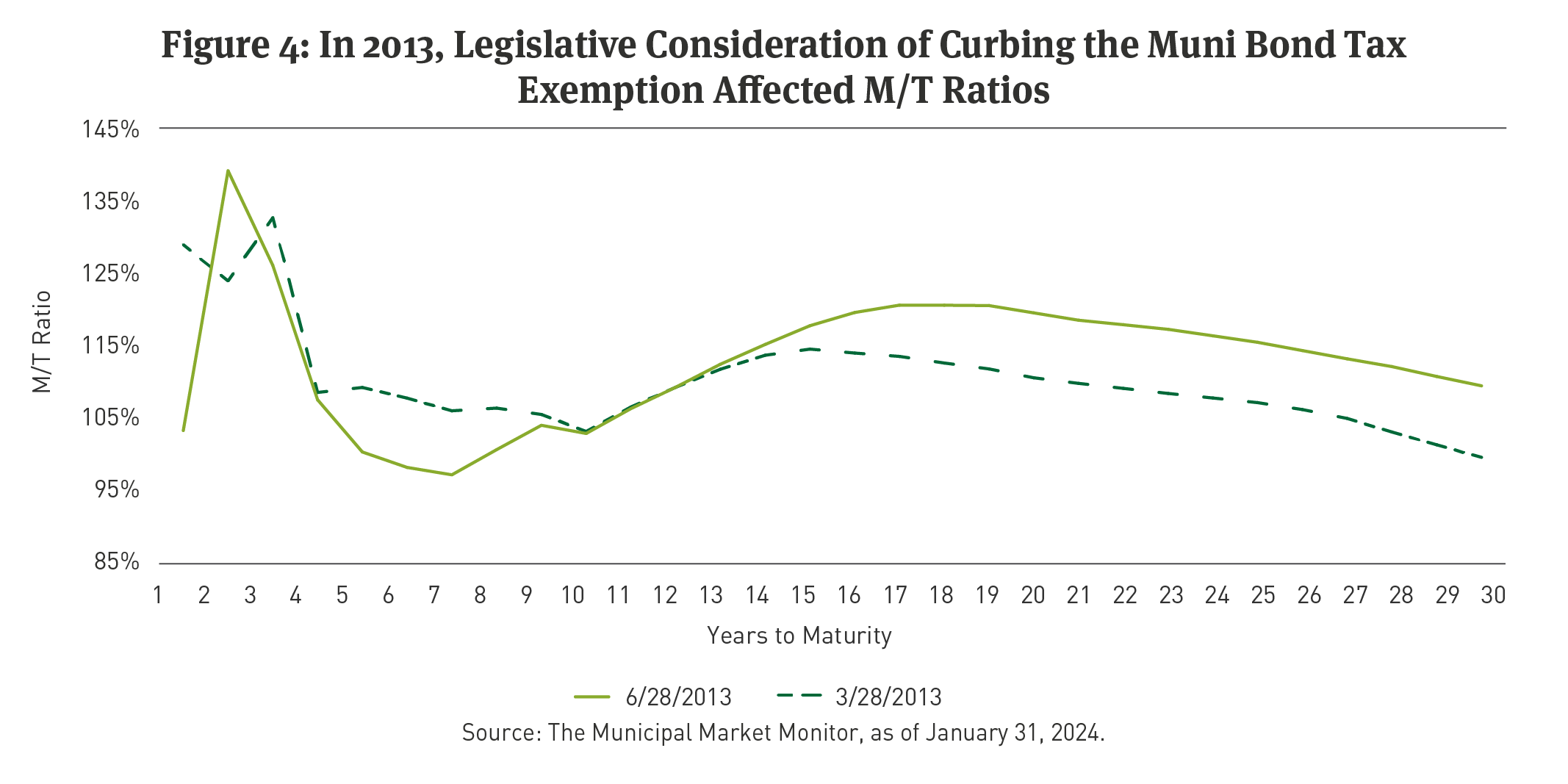 Tax risk can also alter the relative value of munis over a brief time. For example, during the first half of 2013, following an Obama administration proposal to curb the tax-exemption, the AAA muni yield curve often traded above the Treasury curve (i.e., the M/T Ratio was above 100% across the curve) (See Figure 4). The same phenomenon occurred in the months prior to the Tax Reform Act of 1986. Of note, tax-exempt supply might increase over the next few months in 2024 if issuers decide to refinance more Build America Bonds (BABs).2 A near-term surge in BABs refinancings would reflect a recent change in issuers’ understanding of when they can legally refinance BABs, which are a creature of the internal revenue code. In short, when tax risk is elevated, investors want to be compensated.