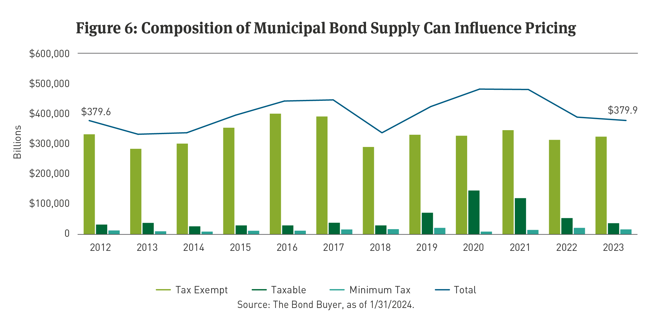 Second, in 2017, Congress passed the Tax Cuts and Jobs Act (TCJA). That law prohibits tax-exempt advance refundings,3 which had comprised as much as 20 percent of new issue supply, annually. Municipal issuance declined, as shown by data reported by The Bond Buyer. (See Figure 6.)