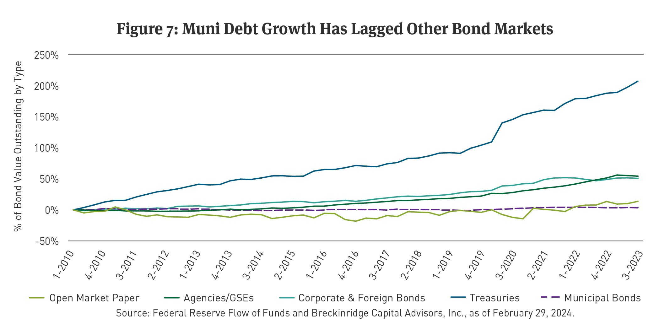 Figure 7 underscores this idea. While debt in other fixed income markets has grown since the GFC, the muni market has not kept up.