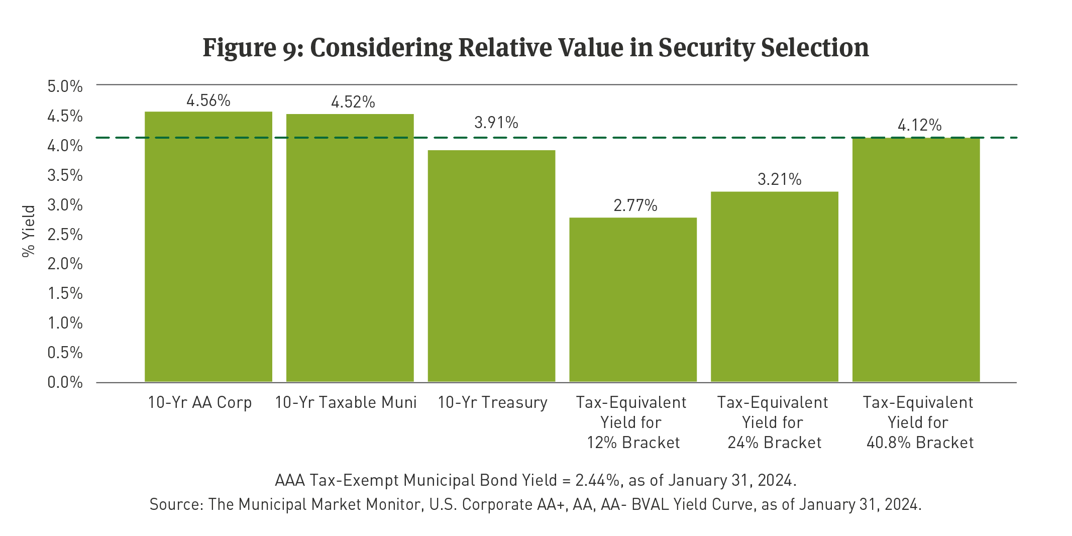 Investors should prioritize flexibility when it comes to buying tax-exempt versus taxable bonds. A tax-exempt bond will not always be the most tax-efficient investment in today’s market (See Figure 9). Even for an investor in a mid- to top-tier tax bracket, a taxable bond will sometimes be the best purchase, on an after-tax basis, when M/T Ratios break away from historical norms as illustrated previously.