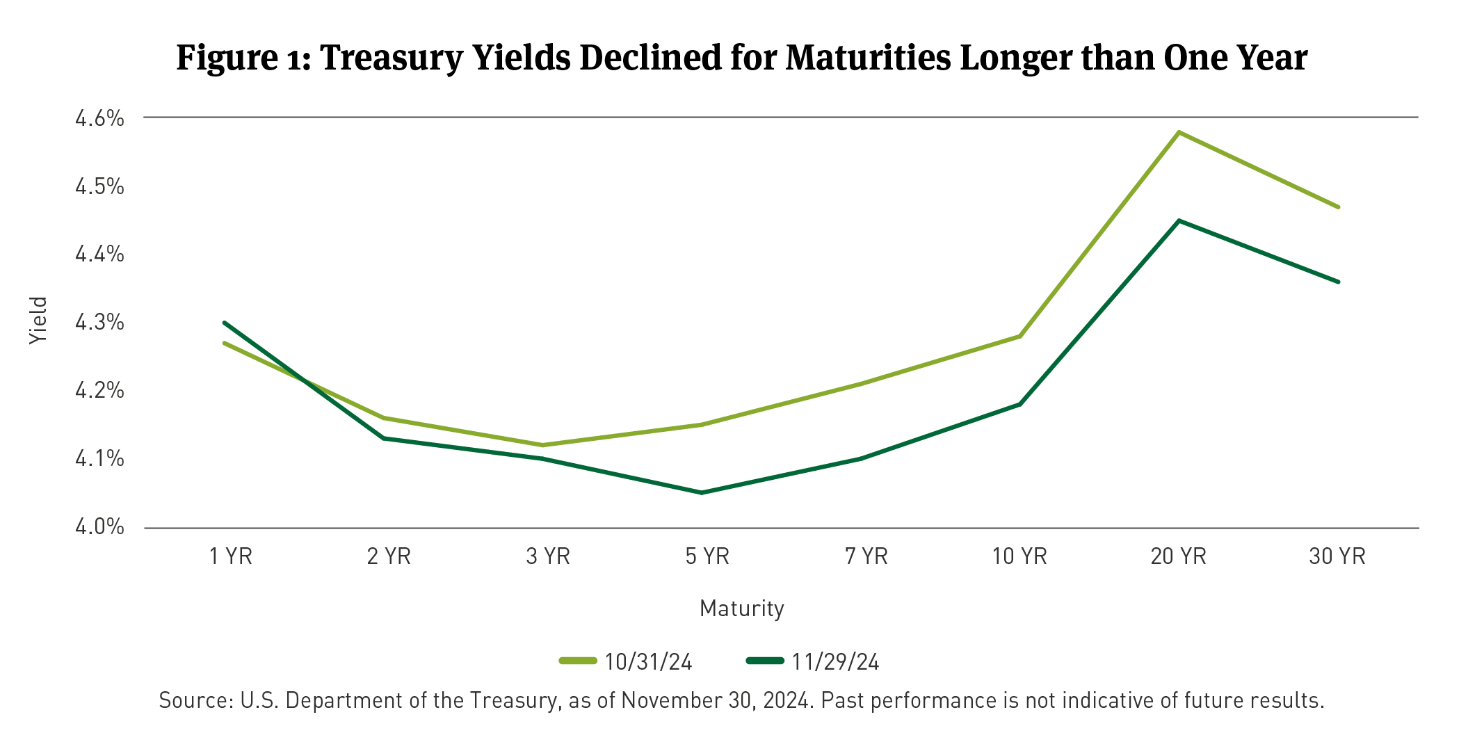 Treasury yields declined following the U.S. elections, as Republicans captured the Presidency and majorities in the U.S. Senate and House of Representatives. Coupled with positive economic news9 and a cut of 25bps in the federal funds rate, investors bid up Treasuries (See Figure 1).