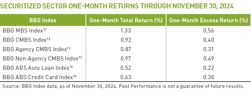 Based on BBG data, by November’s month-end, total and excess returns YTD were positive for all securitized sectors.