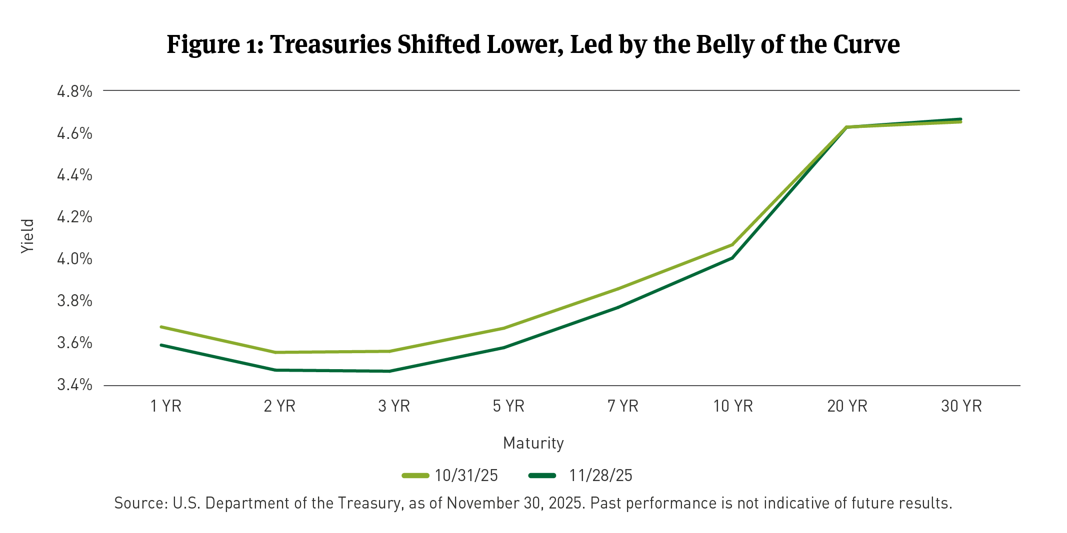 - U.S. Treasury Curve: U.S. Treasury yields declined across the 2-year, 5-year, and 10-year maturities, while the 30-year yield remained unchanged.