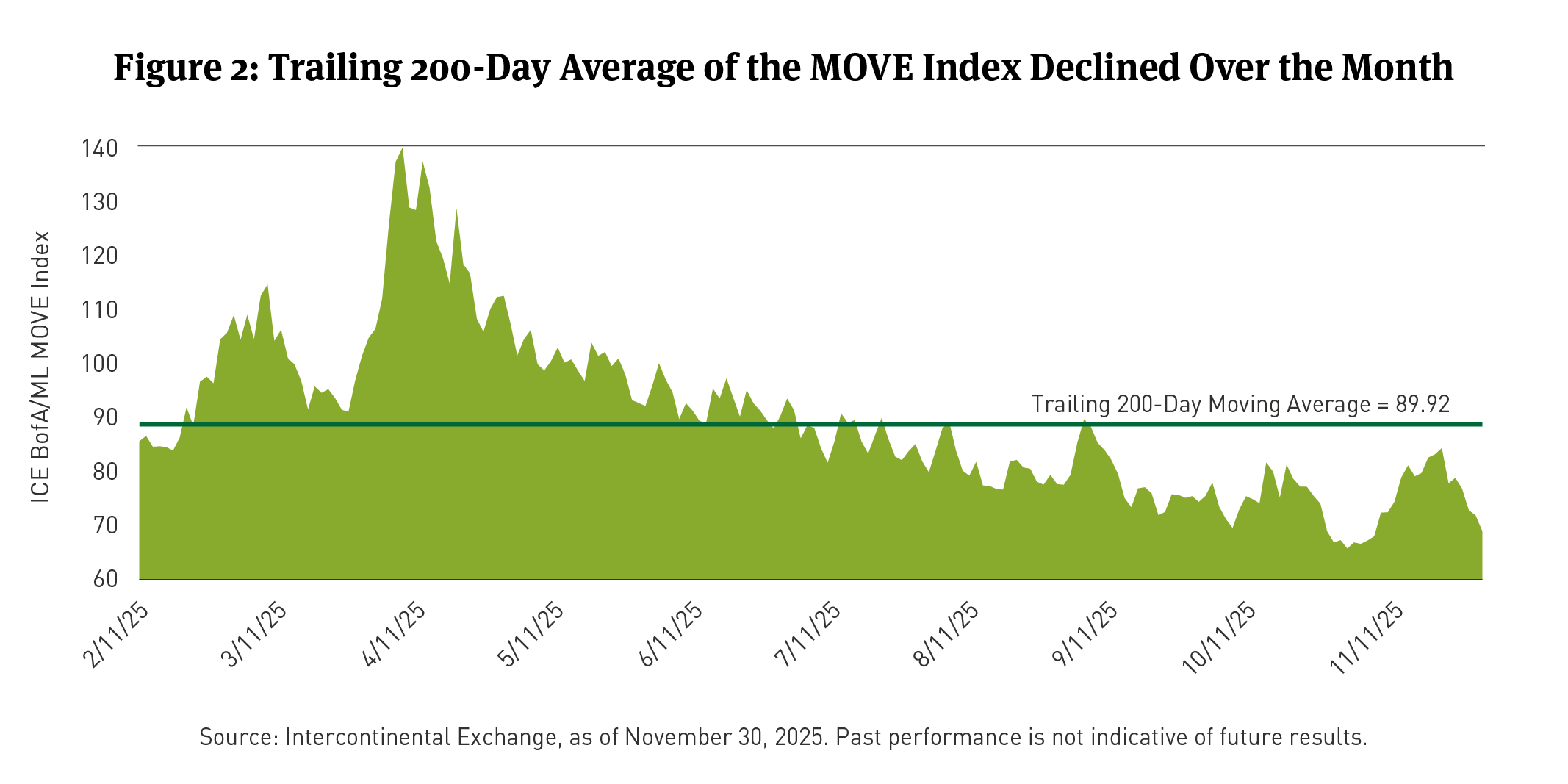 [3] As of November 30, 2025, based on the Intercontinental (ICE) Bank of America/Merrill Lynch Option Volatility Estimate (MOVE) Index, which tracks the movement in U.S. Treasury yield volatility implied by current prices of one-month over-the-counter options on 2-year, 5-year, 10-year and 30-year Treasuries. Historically, the index rises as concerns grow that interest rates may be higher. You cannot invest directly in an index.
