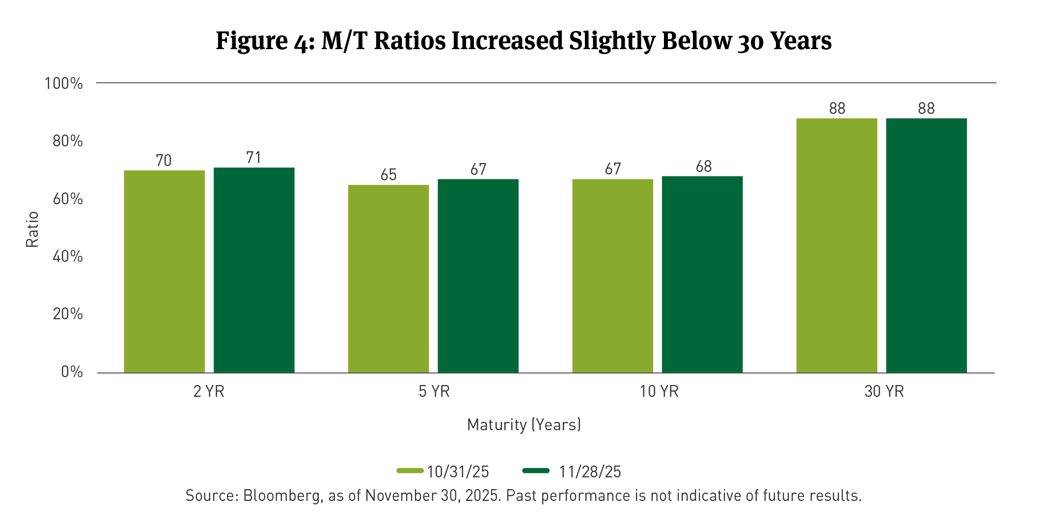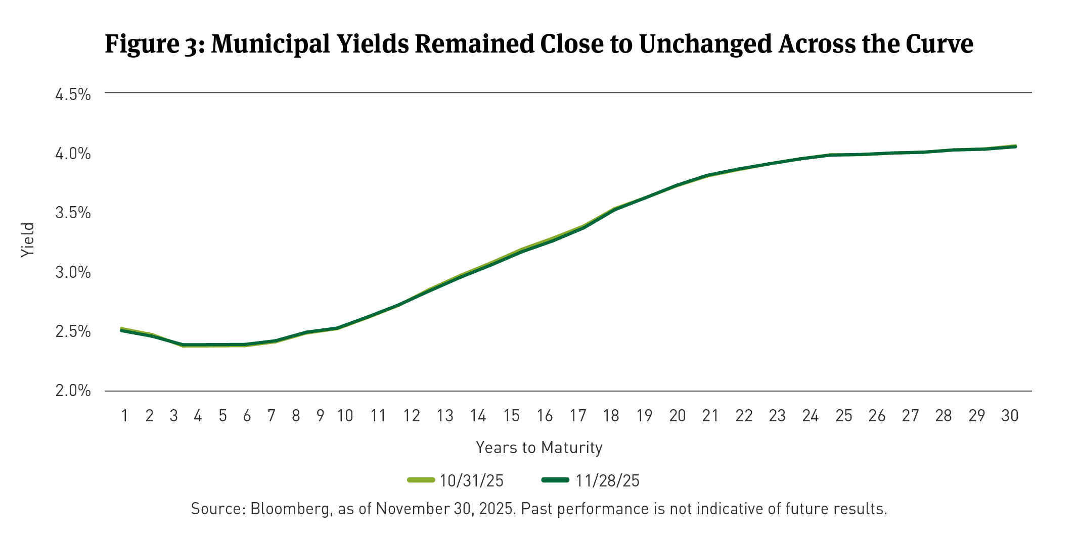 The Bloomberg Short/Intermediate Municipal Bond Index4 posted a modest total return of 0.23 percent in November, reflecting slight price appreciation despite limited movement in yields. Municipal yields were largely unchanged across the curve, falling by 1bp at the 2-year and 30-year tenors, rising by 1bp at the 5-year, and remaining flat at the 10-year (See Figure 3). Muni yield stability contrasted with broader Treasury yield declines across most maturities.