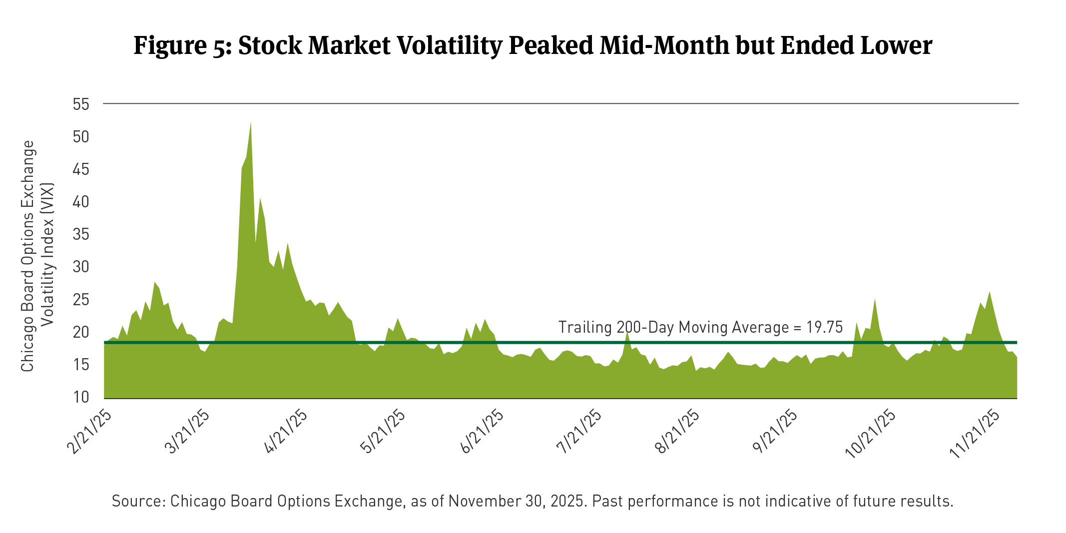 The S&P 500 Index recorded a modest total return of 0.25 percent for November. The Chicago Board Options Exchange (CBOE) Volatility Index8 (VIX), a measure of equity market volatility, reached an intramonth high not seen since April’s drawdown, temporarily exceeding the 200-day moving average of 19.75 at month-end (See Figure 5) before moderating to below that level by the end of the month.