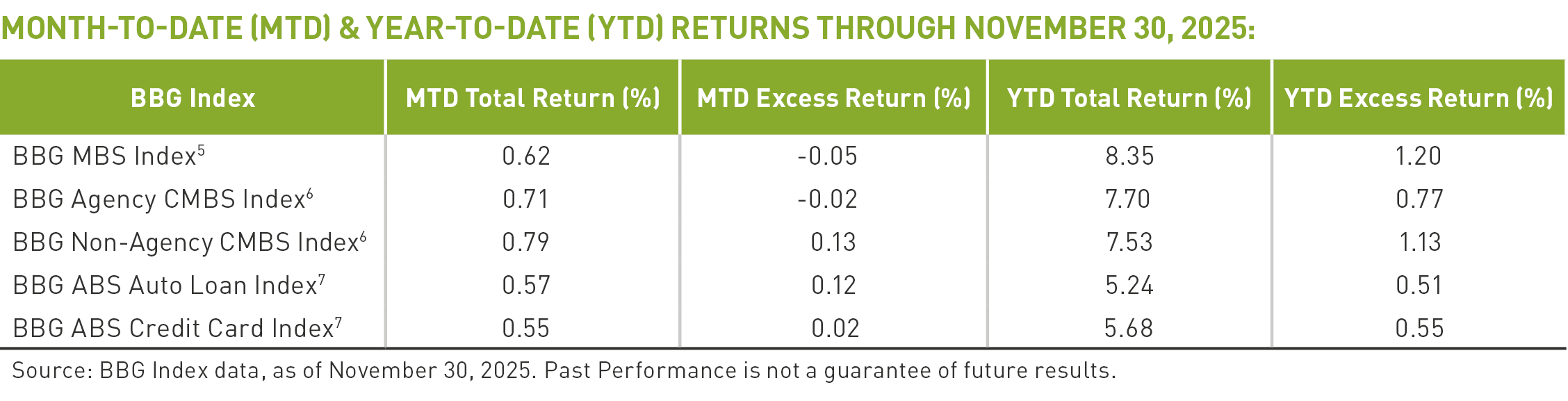 - Securitized Markets: Both mortgage-backed (MBS) and asset-backed securities (ABS) posted positive total returns in November.